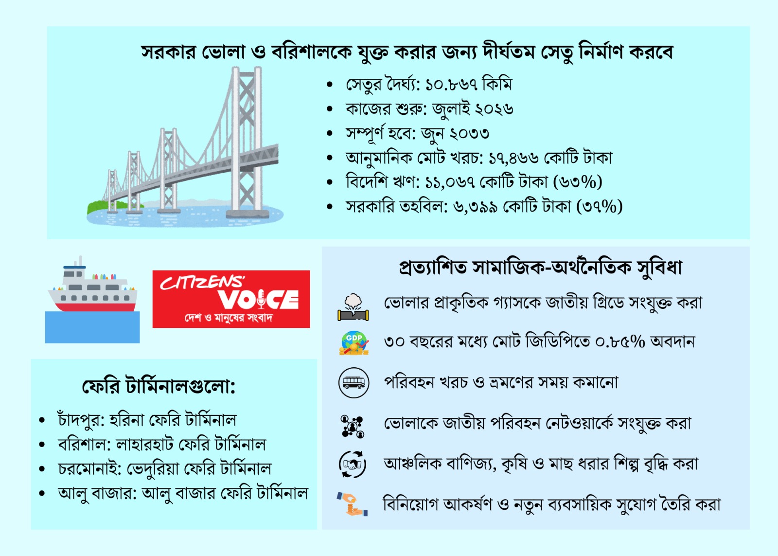 ভোলা–বরিশাল সেতু: দুটি প্রকল্পের মধ্যে সবচেয়ে বড় হলো ভোলা–বরিশাল সেতু। ব্যয় ধরা হয়েছে ১৭ হাজার ৪৬৬ কোটি টাকা। ১০ দশমিক ৮৬ কিলোমিটার দীর্ঘ এই সেতুটি দেশের সবচেয়ে বড় হবে। এটি ভোলা দ্বীপকে স্থায়ীভাবে বরিশালের সঙ্গে যুক্ত করবে। ২০২৪ সালের সম্ভাব্যতা সমীক্ষায় বলা হয়েছে, সেতুটি বিনিয়োগ আকর্ষণ করবে, কর্মসংস্থান সৃষ্টি করবে এবং আগামী ৩০ বছরে জিডিপিতে ০.৮৬ শতাংশ অবদান রাখবে। পাশাপাশি ভোলা থেকে জাতীয় গ্রিডে প্রাকৃতিক গ্যাস সরবরাহও সহজ হবে। জাপানের মিয়াগাওয়া কনস্ট্রাকশন লিমিটেড অর্থায়নে আগ্রহ দেখিয়েছে।
