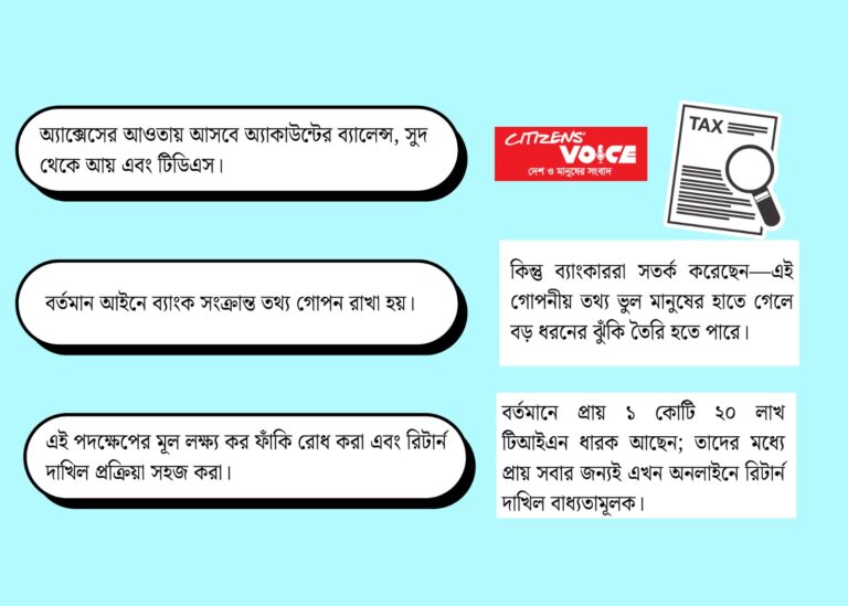 আরেক কর্মকর্তা জানান, “আমরা শুধু তিন ধরনের তথ্য চাইছি—সুদের আয়, উৎসে কর্তনকৃত কর এবং সংশ্লিষ্ট অর্থবছরের শেষ দিনের অ্যাকাউন্ট ব্যালান্স। এর বাইরে কোনো লেনদেনের তথ্য চাইছি না। বিদ্যমান ব্যাংক কোম্পানি আইন সংশোধন প্রয়োজন হলে সরকার সেটি বিবেচনা করবে।”