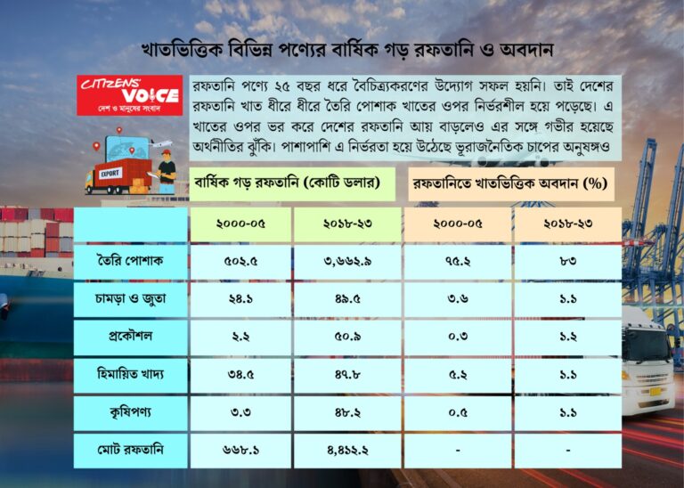 বাংলাদেশের রফতানি খাত দ্রুত বৃদ্ধি পেয়েছে, বিশেষ করে তৈরি পোশাক খাত। এটি দেশের বৈদেশিক আয় ও কর্মসংস্থানের বড় উৎস হলেও, একক খাত ও নির্দিষ্ট দেশের ওপর অতির্ভরতা অর্থনীতি ও রাষ্ট্রীয় নিরাপত্তার জন্য ঝুঁকি তৈরি করেছে। শুল্ক, বাজার নিয়ন্ত্রণ এবং ভূ-রাজনৈতিক চাপের প্রভাবে এই ঝুঁকি আরও স্পষ্ট হয়ে উঠেছে।