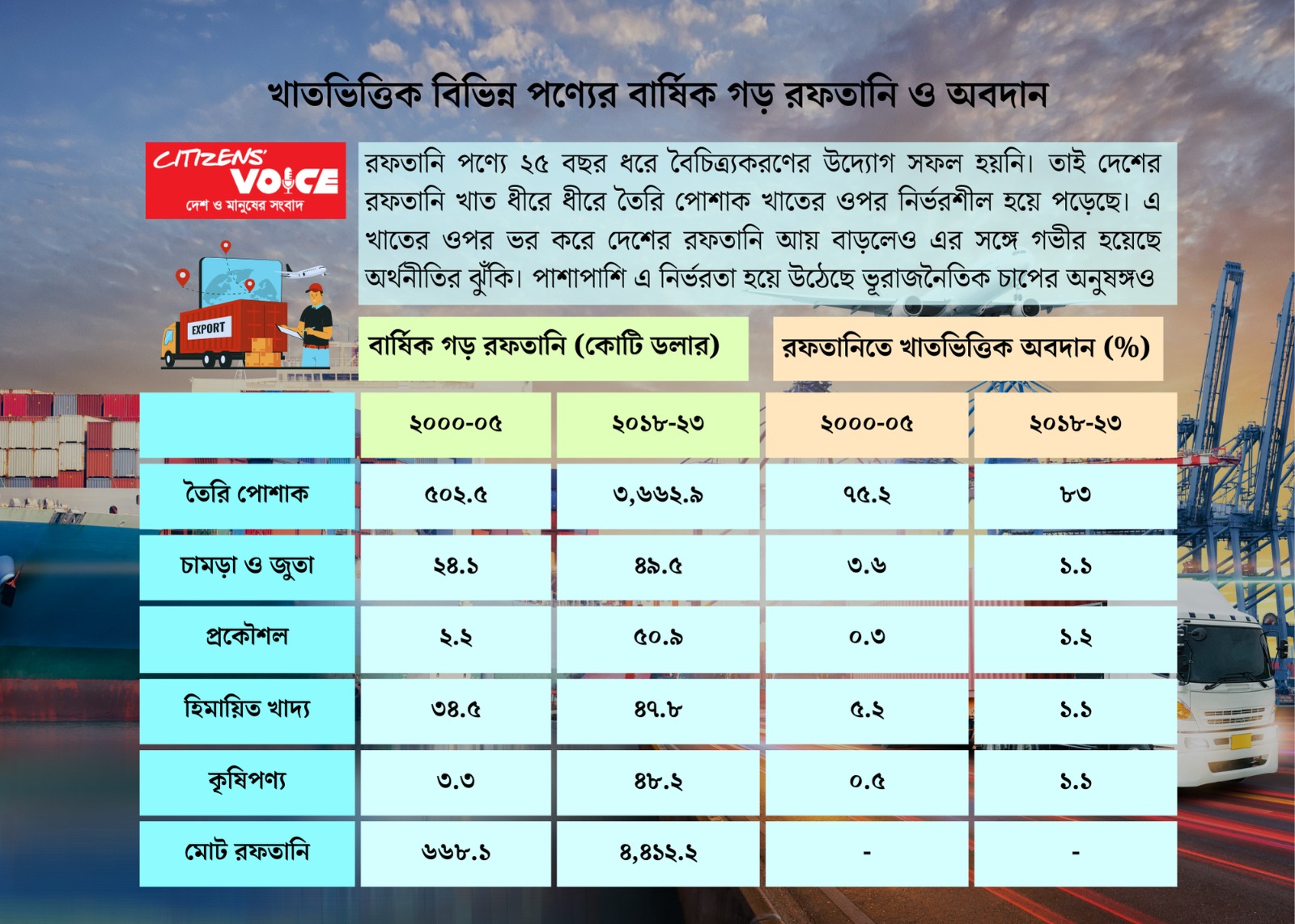 দীর্ঘদিন ধরে পণ্যে বৈচিত্র্য আনার মাধ্যমে দেশের রফতানি আয় বাড়ানোর চেষ্টা করছে সরকার। কিন্তু বাস্তবে এই উদ্যোগগুলো তেমন কার্যকর হয়নি। বরং হিমায়িত খাদ্য, পাট ও চামড়া খাতের রফতানি অবদান ক্রমেই কমছে। এর বিপরীতে তৈরি পোশাক খাত রফতানিতে প্রধান ভূমিকা নিয়েছে। এই খাতের ওপর নির্ভরতা বাড়ার ফলে দেশের রফতানি আয় বৃদ্ধি পেলেও অর্থনীতিতে ঝুঁকি বেড়েছে।