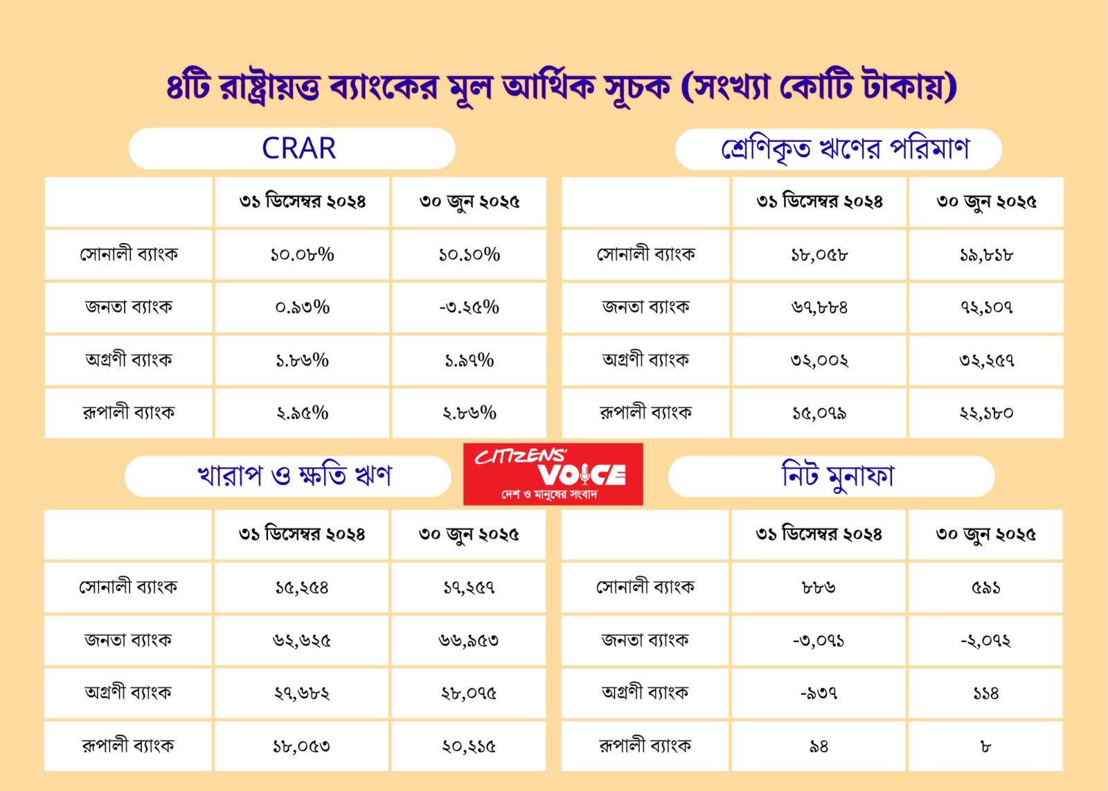 চারটি রাষ্ট্রায়ত্ত ব্যাংকের মধ্যে সবচেয়ে দুর্বল অবস্থায় রয়েছে জনতা ব্যাংক। ২০২৫ সালের জুন শেষে এর মোট ঋণের ৭৬ শতাংশ খেলাপি। খেলাপি ঋণের পরিমাণ দাঁড়িয়েছে ৭২,১০৭ কোটি টাকা, যা গত বছরের ডিসেম্বরে ছিল ৬৭,৮৮৪ কোটি টাকা। এই ঋণের মধ্যে ৯৩ শতাংশ ইতোমধ্যেই ‘খারাপ’ বা ‘ক্ষতি’ হিসেবে চিহ্নিত।