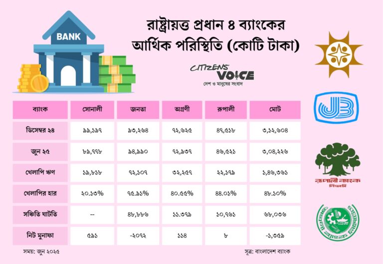 জুন শেষে সোনালী, জনতা, অগ্রণী ও রূপালী ব্যাংকের খেলাপি ঋণ দাঁড়িয়েছে ১ লাখ ৪৬ হাজার ৩৬১ কোটি টাকা। এ পরিমাণ বিতরণকৃত ঋণের প্রায় অর্ধেক, অর্থাৎ ৪৮ দশমিক ১০ শতাংশ। খেলাপি ঋণের বিপরীতে প্রভিশন বা নিরাপত্তা সঞ্চিতি রাখার নিয়ম থাকলেও সেগুলো মানতে পারছে না বেশিরভাগ ব্যাংক। সোনালী ছাড়া বাকি তিন ব্যাংকের সঞ্চিতি ঘাটতি দাঁড়িয়েছে ৬৮ হাজার ৩৬ কোটি টাকা। এ সময়ের মধ্যে জনতা ব্যাংক একাই গুনেছে ২ হাজার ৭২ কোটি টাকার নিট লোকসান।