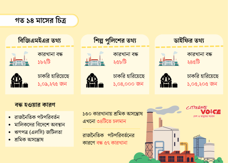 শিল্প পুলিশের তথ্য ভিন্ন চিত্র দেখায়। তাদের হিসাবে, গত এক বছরে পোশাক কারখানাসহ ২৫৮টি কারখানা স্থায়ীভাবে বন্ধ হয়েছে। এখানে এক লাখ চার হাজার শ্রমিক কর্মরত ছিলেন। এর মধ্যে ৫৭টি কারখানা সরাসরি রাজনৈতিক পটপরিবর্তনের কারণে বন্ধ হয়েছে। ২০২৪ সালের ৫ আগস্টের পর কারখানা বন্ধের প্রবণতা বাড়তে শুরু করে। এর মূল কারণ—রাজনৈতিক পরিবর্তন, মালিকদের বিদেশে অবস্থান, ব্যাংকঋণের জটিলতা, বৈদেশিক ক্রেতাদের কার্যাদেশ না পাওয়া, এলসি জটিলতা এবং শ্রমিক অসন্তোষ। এই সংকটের কারণে মালিকরা ব্যবসা চালাতে পারছেন না।