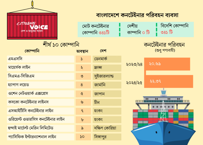 শিপিং কোম্পানি ও বন্দর সূত্রে জানা গেছে, চলতি বছরের জানুয়ারি থেকে জুলাই পর্যন্ত ৩৪১টি কোম্পানি কনটেইনার খাতে ব্যবসা করেছে। সবকটিই বিদেশি। তারা সরাসরি কিংবা এজেন্টের মাধ্যমে বাংলাদেশে ব্যবসা পরিচালনা করছে। বিশ্বের শীর্ষ কোম্পানিগুলোও বাংলাদেশে প্রভাব বিস্তার করেছে। এর মধ্যে ডেনমার্কভিত্তিক মায়ের্সক লাইন, সুইজারল্যান্ডভিত্তিক মেডিটেরানিয়ান কোম্পানি (এমএসসি) এবং ফ্রান্সভিত্তিক সিএমএ–সিজিএম মূল নিয়ন্ত্রণে রয়েছে। পাশাপাশি জার্মানির হ্যাপাগ লয়েড, জাপানের ওশেন নেটওয়ার্ক এক্সপ্রেস (ওয়ান), চীনের কসকো, হংকংয়ের এসআইটিসি কনটেইনার লাইন ও ওরিয়েন্ট ওভারসিস কনটেইনার লাইনও সক্রিয়।