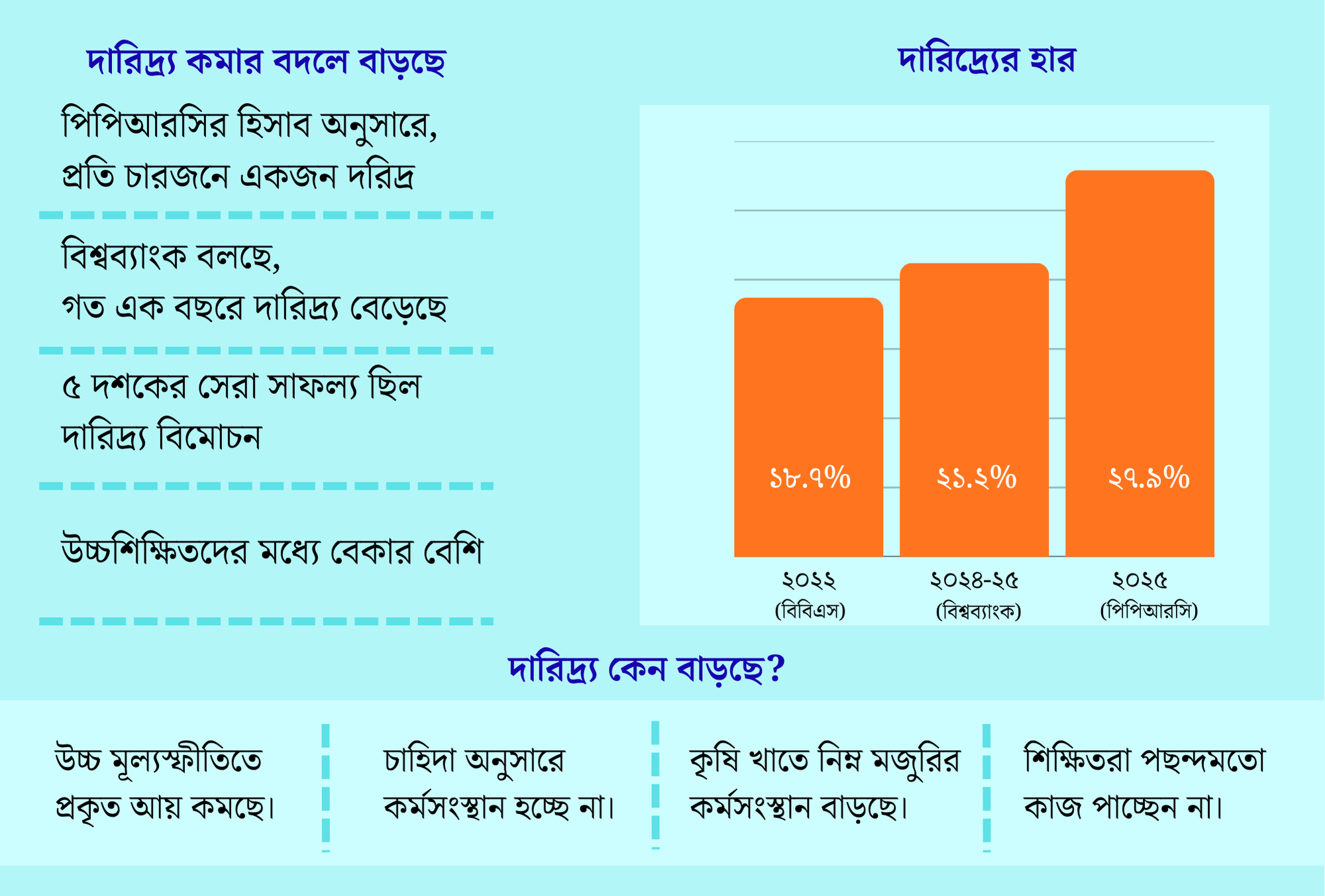 বিশ্বব্যাংকও তাদের সর্বশেষ প্রতিবেদনে বলেছে, ২০২৪-২৫ অর্থবছরে দেশের দারিদ্র্যের হার বেড়ে দাঁড়িয়েছে ২১.২ শতাংশে। এ তথ্যগুলো স্পষ্টভাবে দেখাচ্ছে, দারিদ্র্য পুনরায় বাড়ছে।