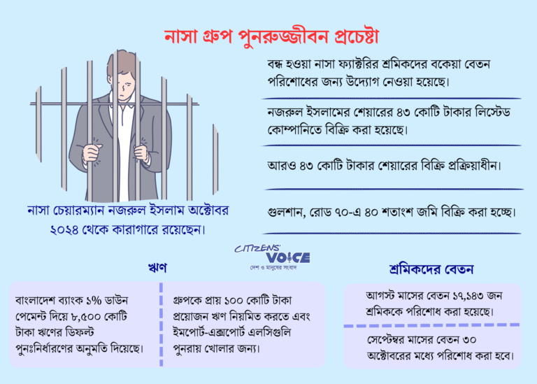 নাসা গ্রুপের ব্যাংক ঋণ ৮ হাজার ৫০০ কোটি টাকার কাছাকাছি, যা গ্রুপের গার্মেন্টস ও টেক্সটাইল শিল্পে বড় ধাক্কা দিয়েছে। জুলাই মাস থেকে বেশ কিছু কারখানা বন্ধ রয়েছে। সরকার ঋণ পুনঃতফসিল এবং শ্রমিকদের বেতন পরিশোধ নিশ্চিত করার জন্য নাসা কর্মকর্তাদের সঙ্গে একাধিক উচ্চপর্যায়ের বৈঠক করেছে। বাংলাদেশ ব্যাংকও ১% ডাউন পেমেন্টের শর্তে ঋণ পুনঃতফসিলের অনুমোদন দিয়েছে।