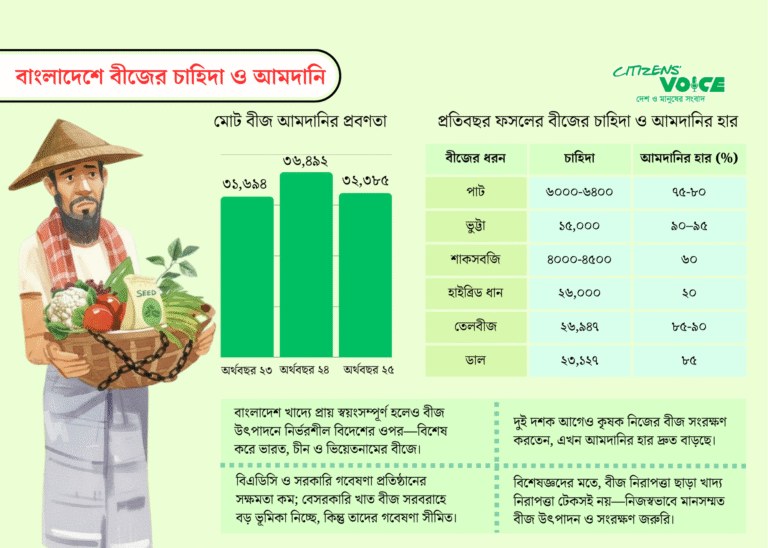 বাংলাদেশের কৃষি উৎপাদন যতই বাড়ুক না কেন, অনেক ফসলের বীজ এখনো বিদেশি উৎসের ওপর নির্ভরশীল। কৃষি মন্ত্রণালয়ের তথ্য অনুযায়ী, ২০২৪–২৫ অর্থবছরে দেশের মোট বীজ চাহিদা ছিল প্রায় ১৩.১৪ লাখ টন। এর মধ্যে ৮.৬৫ লাখ টন আলুর বীজ এবং ৩.৩৫ লাখ টন ধানের বীজ স্থানীয়ভাবে উৎপাদিত হলেও, পাট, ভুট্টা, শাকসবজি, তৈলবীজ ও ডালের চাহিদা মূলত আমদানি করা বীজের মাধ্যমে পূরণ হয়।