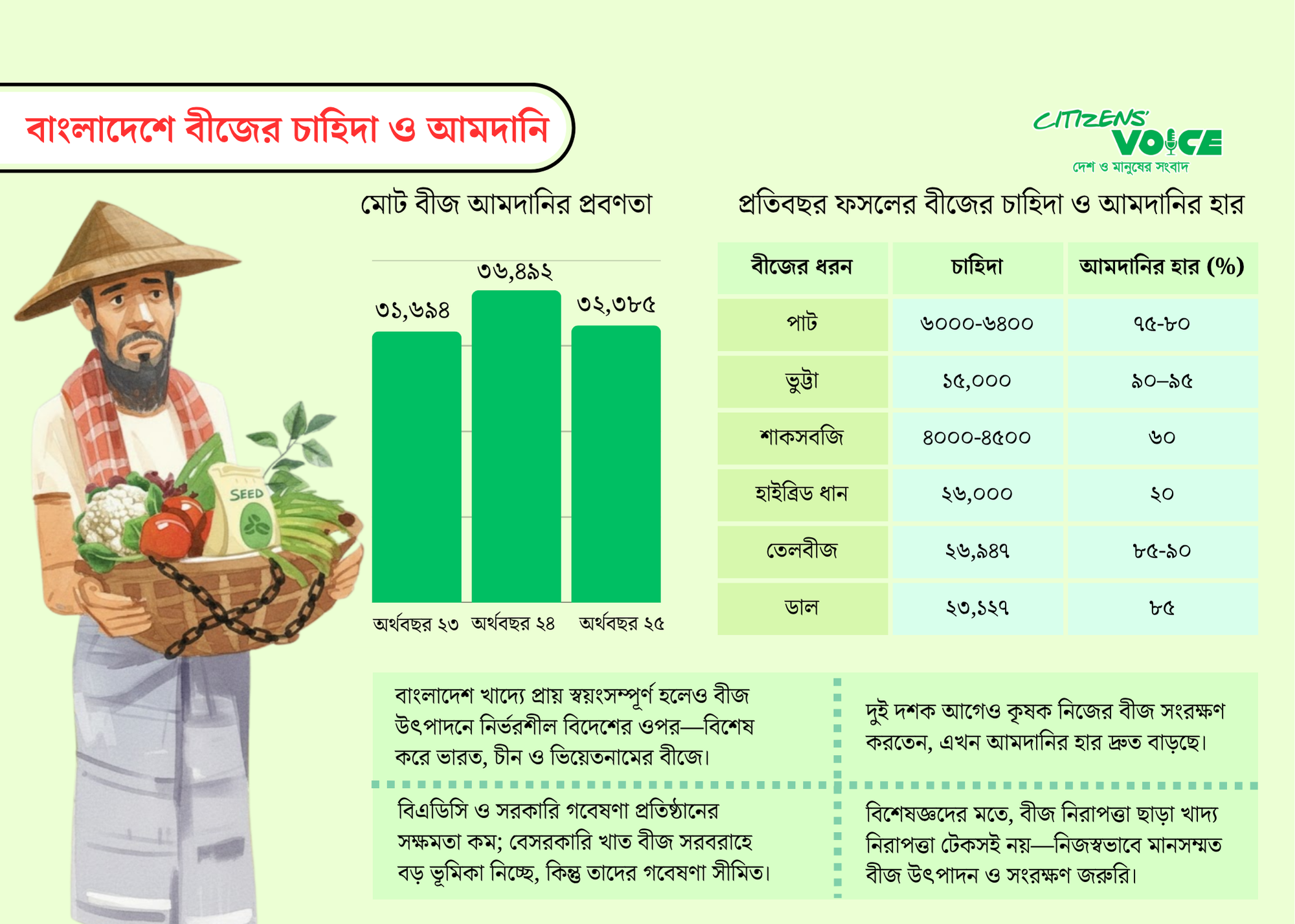 কৃষি সম্প্রসারণ অধিদপ্তর (ডিএই) জানিয়েছে, ২০২৪–২৫ সালে দেশ ৩২,৩৮৫ টন বীজ আমদানি করেছে। তুলনায়, ২০২৩–২৪ সালে আমদানির পরিমাণ ছিল ৩৬,৪৯২ টন এবং ২০২২–২৩ সালে ৩১,৬৯৪ টন। পাটবীজের চাহিদা বছরে ৬,০০০–৬,৪০০ টন, যার ৭৫–৮০ শতাংশই বিদেশ থেকে আসে। ভুট্টার জন্য প্রয়োজন ১৫,০০০ টন বীজ, যার ৯০–৯৫ শতাংশই আমদানি করা। শাকসবজির বীজের চাহিদা ৪,০০০–৪,৫০০ টন, যার প্রায় ৬০ শতাংশ বিদেশি। বিশেষ করে বাঁধাকপি, ফুলকপি, ব্রকলি, বিট ও হাইব্রিড মূলার বীজ প্রায় পুরোপুরি বিদেশি উৎস থেকে আসে।