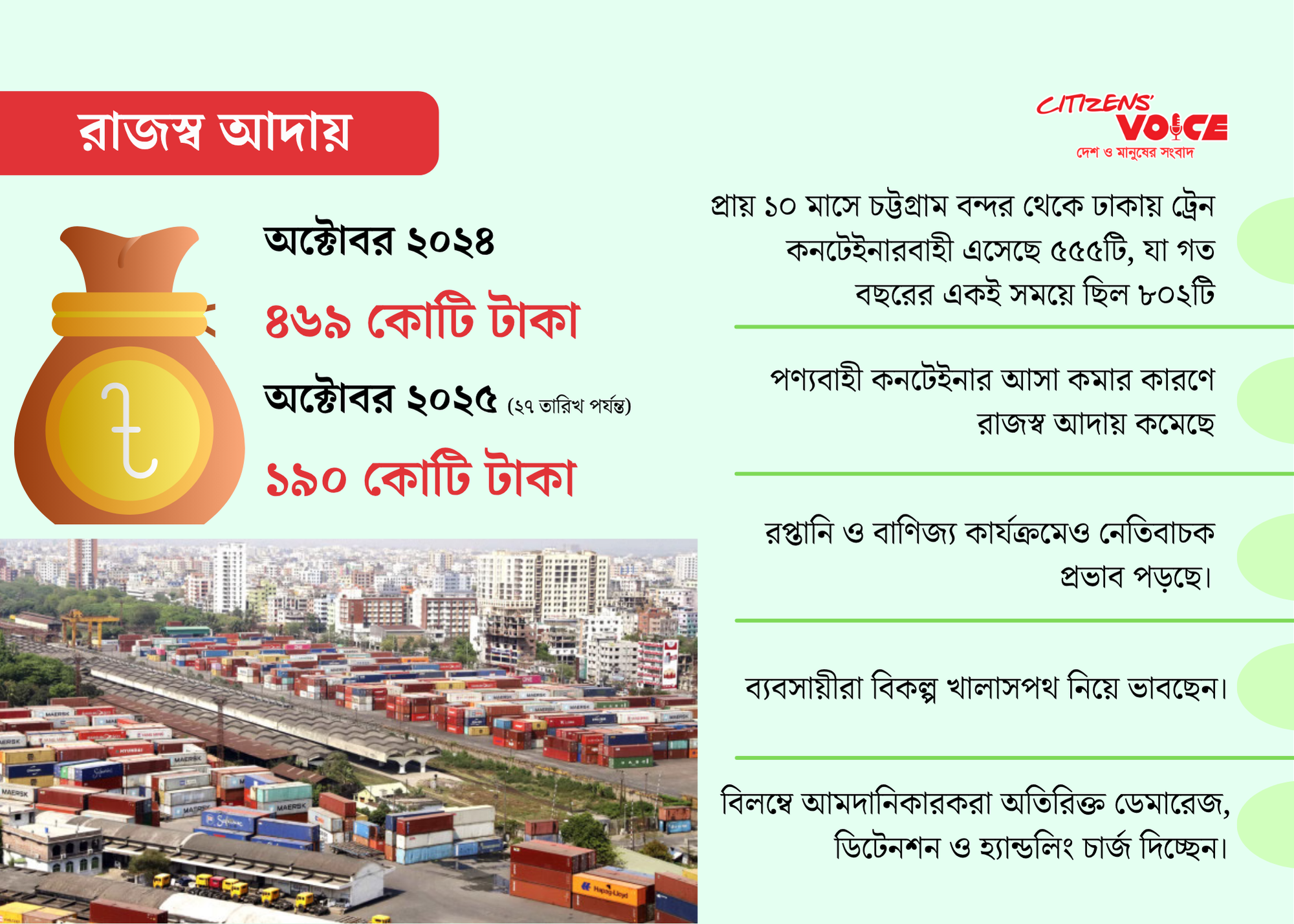 কাস্টম হাউস আইসিডি সূত্রে জানা গেছে, চলতি অক্টোবর মাসে রাজস্ব আদায়ের লক্ষ্যমাত্রা ছিল ৫৭৭ কোটি টাকা, কিন্তু ২৭ অক্টোবর পর্যন্ত আদায় হয়েছে মাত্র ১৯০ কোটি টাকা। গত বছরের একই মাসে আদায় হয়েছিল ৪৬৯ কোটি টাকা। অর্থাৎ, রাজস্ব আদায়ে এবার বড় ধস নেমেছে।
