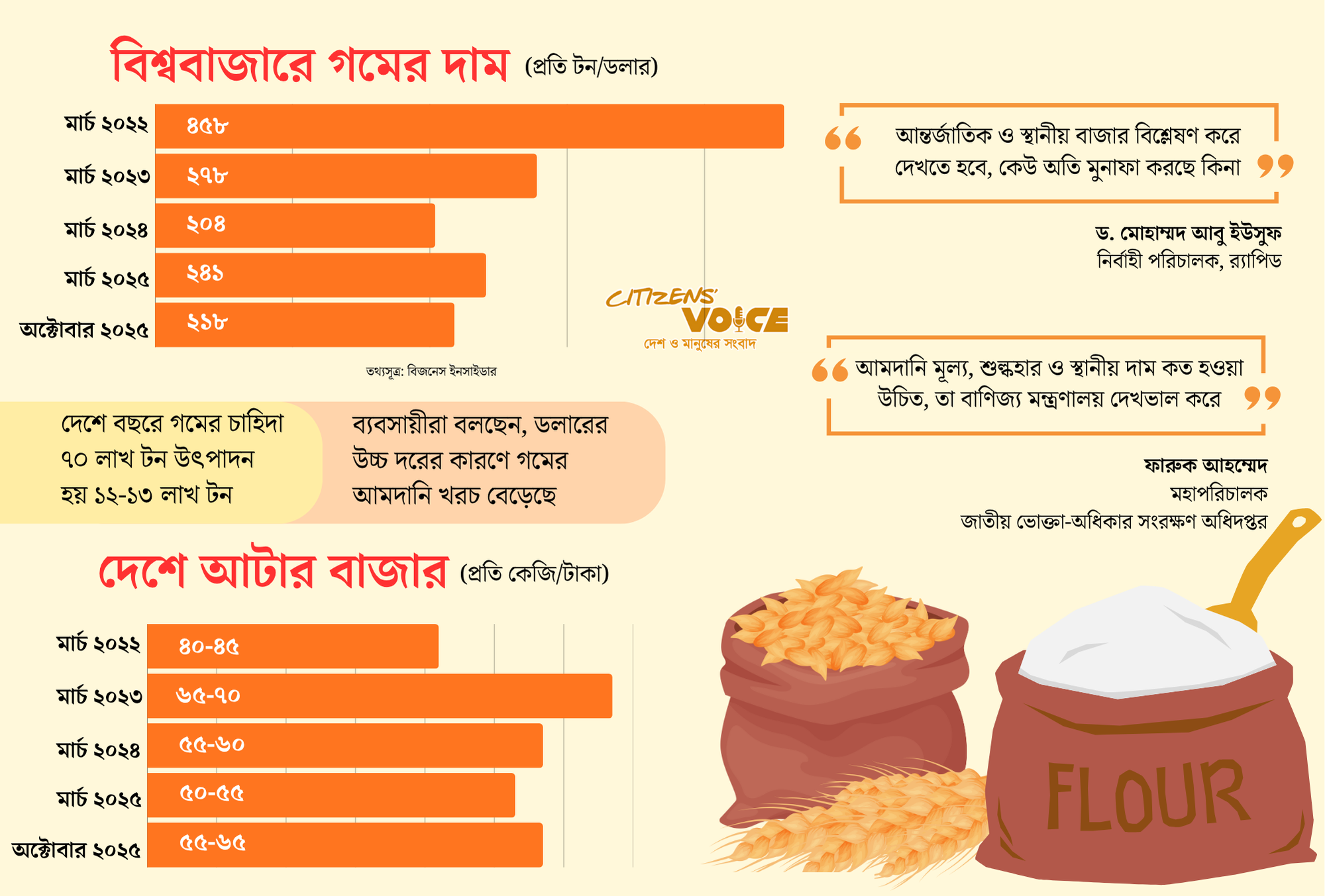 বসুন্ধরা মাল্টি ফুড অ্যান্ড বেভারেজের রেদওয়ানুর রহমান বলেন, ২০২২ সালে বিশ্ববাজারে গমের দাম ৫৭% বেশি ছিল। তখন আমদানিকারকরা কম আমদানি করেছিলেন। এখন ডলারের দাম ৭০% বেড়ে গেছে। পাশাপাশি কিছু শীর্ষ আমদানিকারক গত এক-দেড় বছর ধরে সীমিত আকারে বা কোনো আমদানি না করে ব্যবসা চালাচ্ছেন। ফলে বাজারে সরবরাহ কমেছে। চাহিদা কমেনি বরং বাড়ছে। তাই দাম কমানো কঠিন হয়ে পড়েছে।