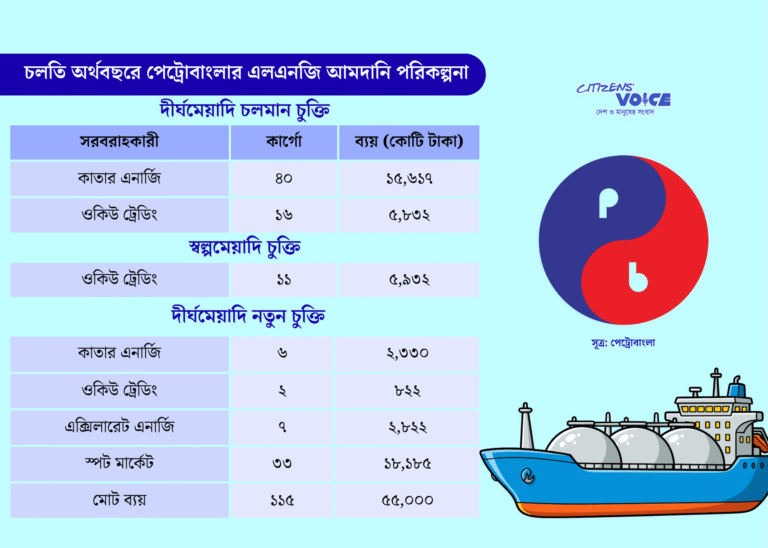 পেট্রোবাংলার তথ্য অনুযায়ী, ২০২৫-২৬ অর্থবছরে মোট ১১৫টি এলএনজি কার্গো কেনা হচ্ছে। এর মধ্যে কাতার এনার্জি থেকে ৪০ কার্গো ১৫ হাজার ৬১৭ কোটি টাকা, ওমান থেকে ১৬ কার্গো ৫ হাজার ৮৩২ কোটি, স্বল্পমেয়াদি চুক্তিতে ১১ কার্গো ৫ হাজার ৯৩২ কোটি। নতুন দীর্ঘমেয়াদি চুক্তিতে কাতার এনার্জি থেকে ৬ কার্গো ২ হাজার ৩৩০ কোটি, ওকিউ ট্রেডিং থেকে ২ কার্গো ৮২২ কোটি, মার্কিন এক্সিলারেট এনার্জি থেকে ৭ কার্গো ২ হাজার ৮২২ কোটি। স্পট মার্কেট থেকে ৩৩ কার্গো ১৮ হাজার ১৮৫ কোটি টাকায় কেনা হবে।