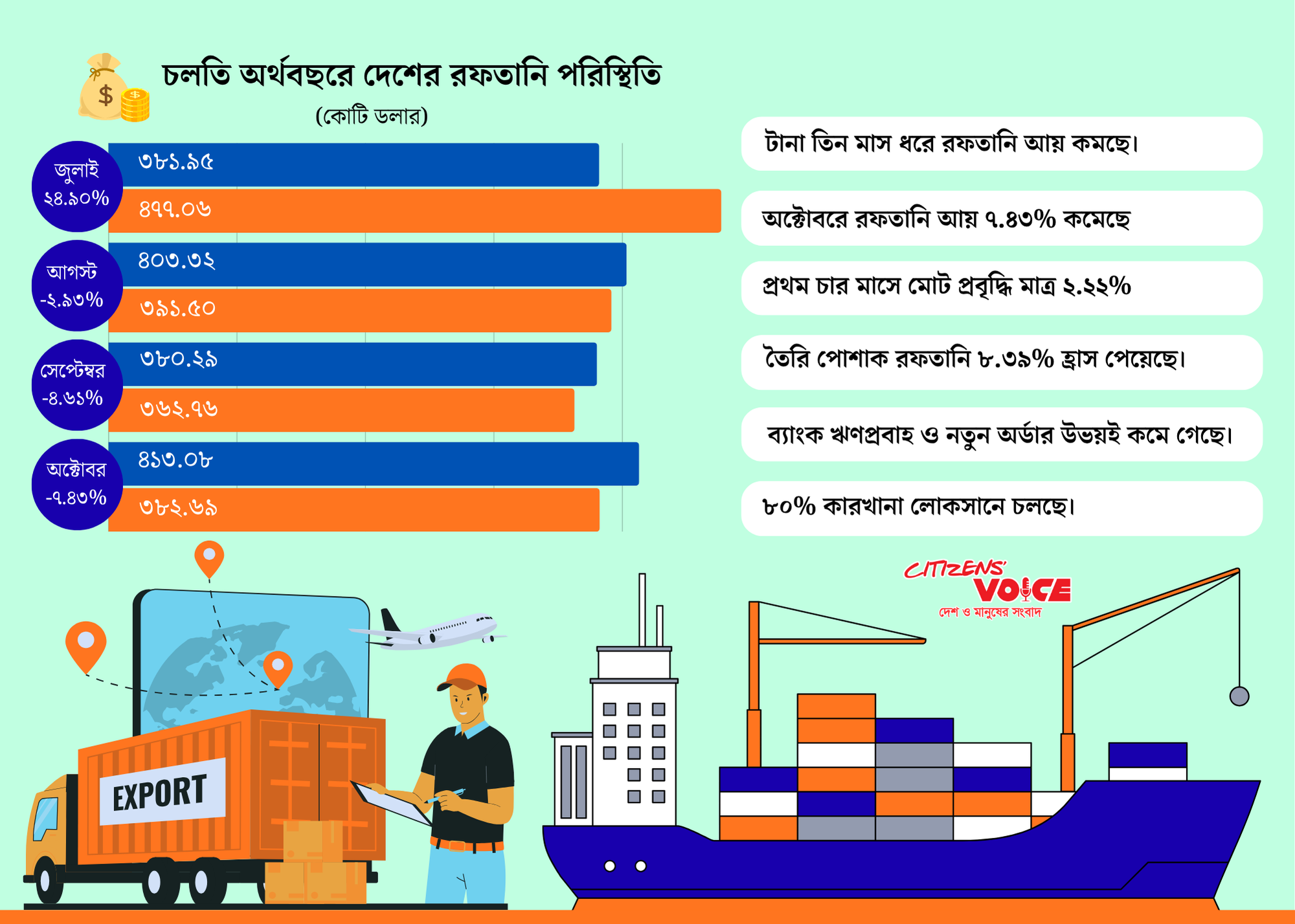 দেশের অর্থনৈতিক কর্মকাণ্ডে সামগ্রিকভাবে কিছুটা স্বস্তির আভাস থাকলেও রফতানি খাতের গতিশীলতা কমে এসেছে। চলতি অর্থবছরের প্রথম চার মাসে রফতানি আয় ও রেমিট্যান্স কিছুটা ভালো থাকলেও গত তিন মাস ধরে রফতানি আয় কমছে। বিশেষ করে অক্টোবর মাসে রফতানি আয় ৭.৪৩ শতাংশ কমে গেছে।