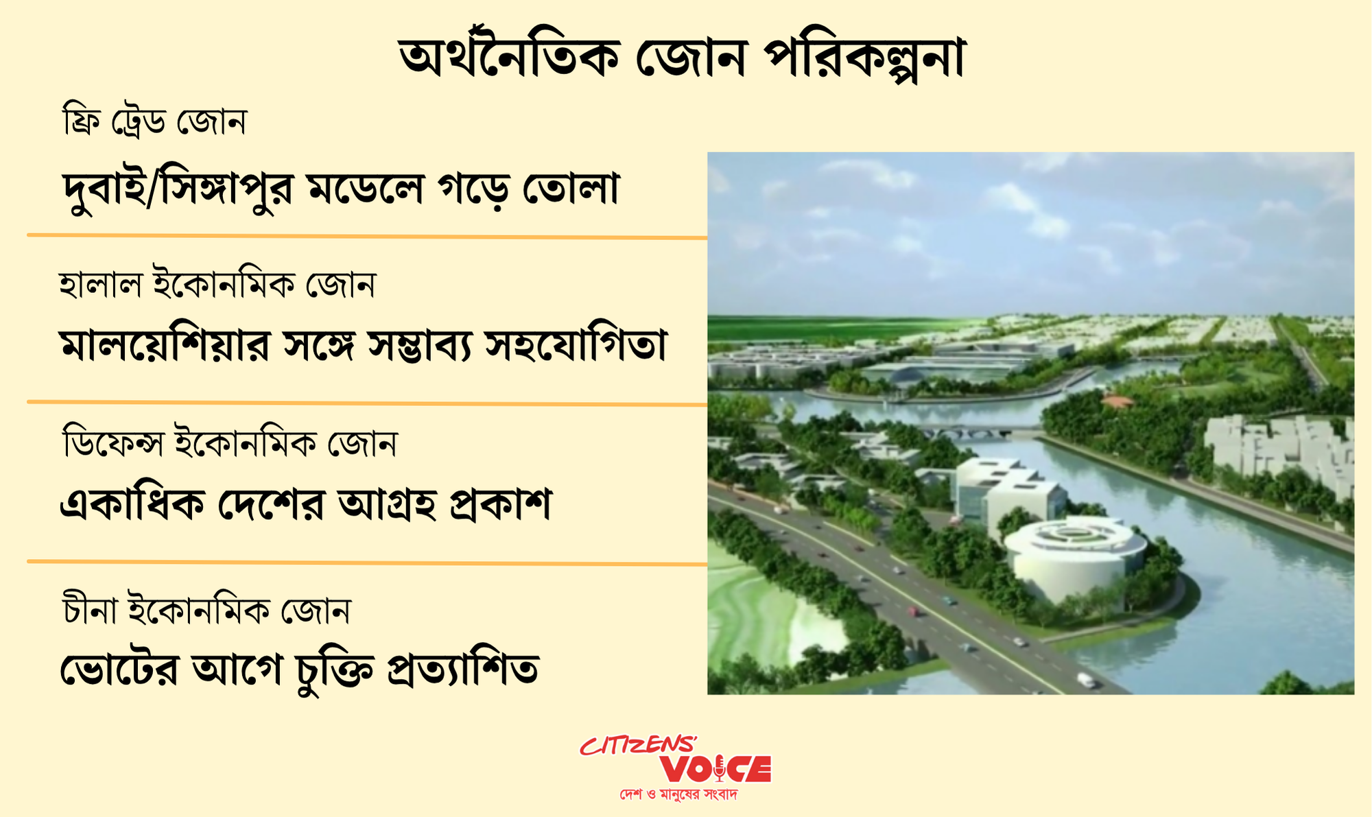 দ্বিতীয়টি হচ্ছে, একটি হালাল ইকোনমিক জোন প্রতিষ্ঠার ব্যাপারে আমরা কাজ করছি। এটি নিয়ে আমরা মালেশিয়ার সরকারের সঙ্গে দেখা করব, তাদের সহযোগিতা চাব। আর তৃতীয়টি হচ্ছে, বিশেষায়িত ডিফেন্স ইকোনমিক জোন। এটি আমাদের জাতীয় স্বার্থ ও নিরাপত্তার দিক থেকে গুরুত্বপূর্ণ এবং এর একটি ইকোনমিক ইন্টারেস্ট আছে, বাণিজ্যিক যুক্তি আছে। আমার ফোকাসটা আসলে বাণিজ্যিক। এটা নিয়ে আমরা পলিসি লেভেলে কাজ করছি। পলিসি চূড়ান্ত হলে নির্বাচনের পরে আগামী সরকার জোনটি ঘোষণা করবে। জোনে কোন ধরনের ব্যবসা হবে, কোন দেশের সাথে তারা সহযোগিতা করবে, সেটা তখন সিদ্ধান্ত নেবে।