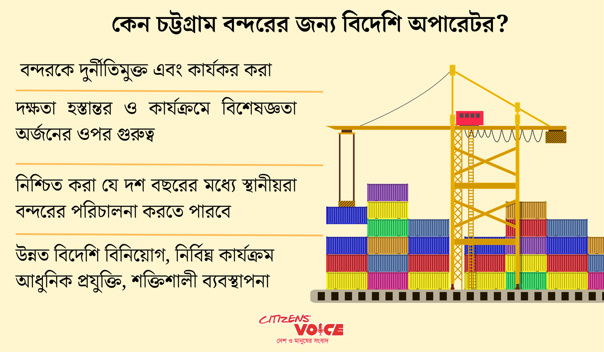 আশিক চৌধুরী: বিদেশি অপারেটর নিয়োগের মূল লক্ষ্য হলো মূল লক্ষ্য হলো একটি দুর্নীতিমুক্ত এবং উচ্চ কার্যক্ষমতা সম্পন্ন লজিস্টিক সিস্টেম তৈরি করা। গ্লোবাল স্ট্যান্ডার্ডের অপারেটর নিয়োগ দেওয়া হলে এন্টি-করাপশন নিশ্চিত হবে এবং সর্বোচ্চ প্রযুক্তি ব্যবহার করা সম্ভব হবে। বিদেশি অপারেটরের মাধ্যমে পোর্ট পরিচালনার হলে বাংলাদেশি কর্মী এবং ম্যানেজমেন্ট টিম দক্ষতা অর্জন করতে পারবে।