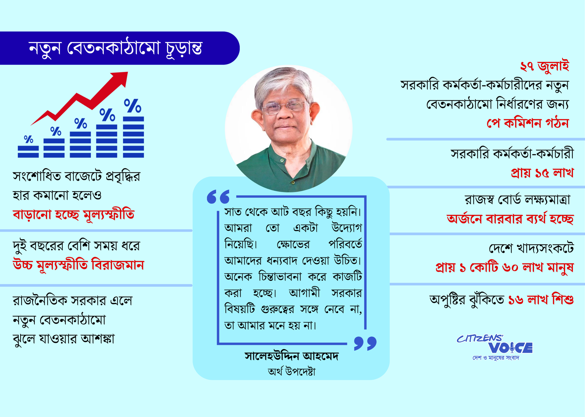 গত ২৭ জুলাই সরকারি কর্মকর্তা-কর্মচারীদের জন্য নতুন পে-কমিশন গঠন করা হয়। সাবেক অর্থসচিব জাকির আহমেদ খানের নেতৃত্বে ছয় মাসের মধ্যে এই কমিশনকে প্রতিবেদন জমা দিতে বলা হয়েছে। বর্তমানে প্রায় ১৫ লাখ সরকারি কর্মকর্তা-কর্মচারী ২০১৫ সালের পে-স্কেল অনুযায়ী বেতন পান। দীর্ঘদিনের উচ্চ মূল্যস্ফীতির কারণে তাদের প্রকৃত আয় কমে যাওয়ায় নতুন কাঠামোর দাবি জোরালো হয়ে উঠেছে।