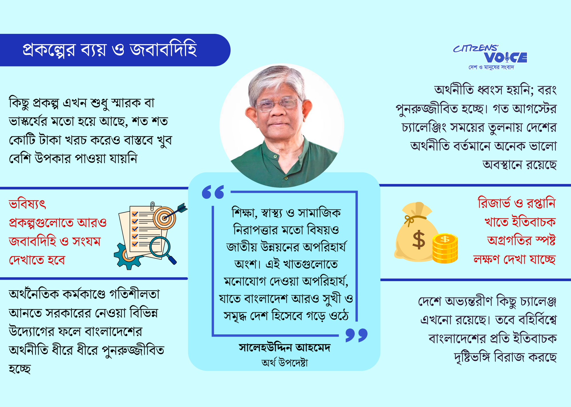 উপদেষ্টা বলেন, শিক্ষা, স্বাস্থ্য ও সামাজিক নিরাপত্তা জাতীয় উন্নয়নের অপরিহার্য অংশ। এই খাতগুলোতে মনোযোগ দিলে বাংলাদেশ আরও সুখী ও সমৃদ্ধ দেশ হিসেবে গড়ে উঠবে। ড. সালেহউদ্দিন আরও জানান, অর্থনীতি ধ্বংস হয়নি, বরং পুনরুজ্জীবিত হচ্ছে। গত আগস্টের চ্যালেঞ্জিং সময়ের তুলনায় এখন দেশের অর্থনীতি অনেক ভালো অবস্থানে রয়েছে। গুরুত্বপূর্ণ খাতে উল্লেখযোগ্য উন্নতি লক্ষ্য করা যাচ্ছে।