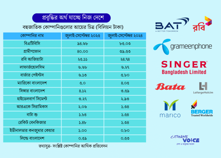 দেশের পুঁজিবাজারে তালিকাভুক্ত ১৩টি বহুজাতিক কোম্পানি হলো— গ্রামীণফোন, ব্রিটিশ আমেরিকান টোব্যাকো বাংলাদেশ (বিএটিবিসি), রবি আজিয়াটা, লাফার্জহোলসিম বাংলাদেশ, বার্জার পেইন্টস, ম্যারিকো, সিঙ্গার বাংলাদেশ, হাইডেলবার্গ সিমেন্ট, আরএকে সিরামিকস, রেকিট বেনকিজার, বাটা শু, লিন্ডে বাংলাদেশ এবং ইউনিলিভার কনজ্যুমার কেয়ার লিমিটেড। চলতি ২০২৫-২৬ অর্থবছরের প্রথম তিন মাসে এই কোম্পানিগুলোর সম্মিলিত আয় হয়েছে ১৯১.৯৬ বিলিয়ন বা ১৯ হাজার ১৯৬ কোটি টাকা। আগের অর্থবছরের একই সময়ে আয় ছিল ১৭৭.৪৯ বিলিয়ন বা ১৭ হাজার ৭৪৯ কোটি টাকা। অর্থাৎ বছরের ব্যবধানে আয় বেড়েছে ১৪.৪৭ বিলিয়ন বা ১ হাজার ৪৪৭ কোটি টাকা। শতকরা প্রবৃদ্ধি ৮.১৫ শতাংশ।