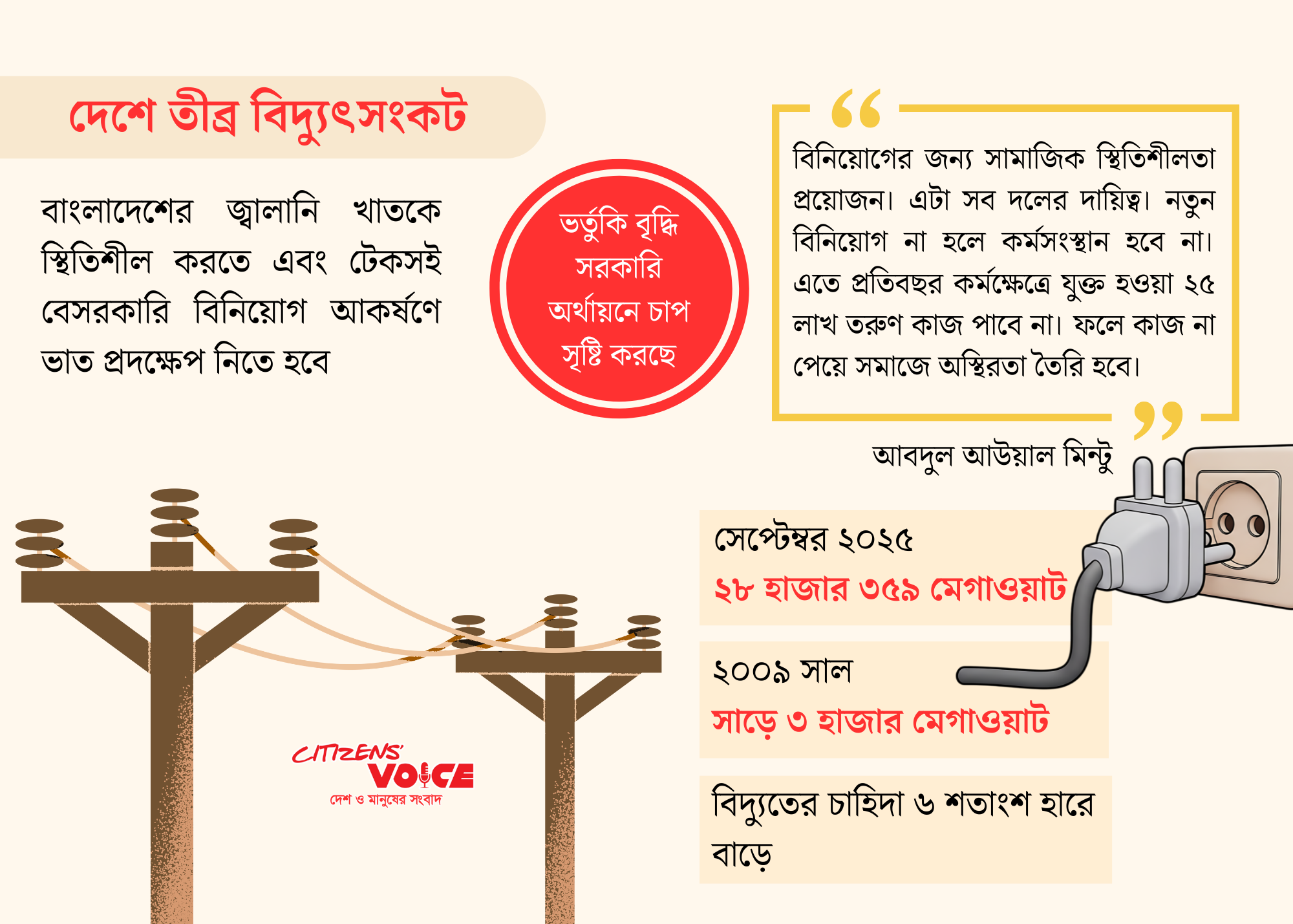 বিদ্যুৎ খাতে ১ দশমিক ৩৯ ট্রিলিয়ন টাকা এবং গ্যাস খাতে ৬৮০ বিলিয়ন টাকার বাড়তি ভর্তুকি সরকারের অর্থায়নে বড় চাপ সৃষ্টি করছে। বিশেষজ্ঞরা বলছেন, এই ভর্তুকি বৃদ্ধির কারণে খাতের দীর্ঘমেয়াদি টেকসইতা হুমকির মুখে। বিদ্যুৎ খাতের ৬৫ শতাংশেরও বেশি জ্বালানি আমদানি করা হয়। এর ফলে বিশ্ববাজারে দামের ওঠানামার জন্য খাতটি ঝুঁকিপূর্ণ হয়ে পড়েছে। অন্যদিকে, অভ্যন্তরীণ গ্যাস অনুসন্ধান ধীরগতিতে চলছে।