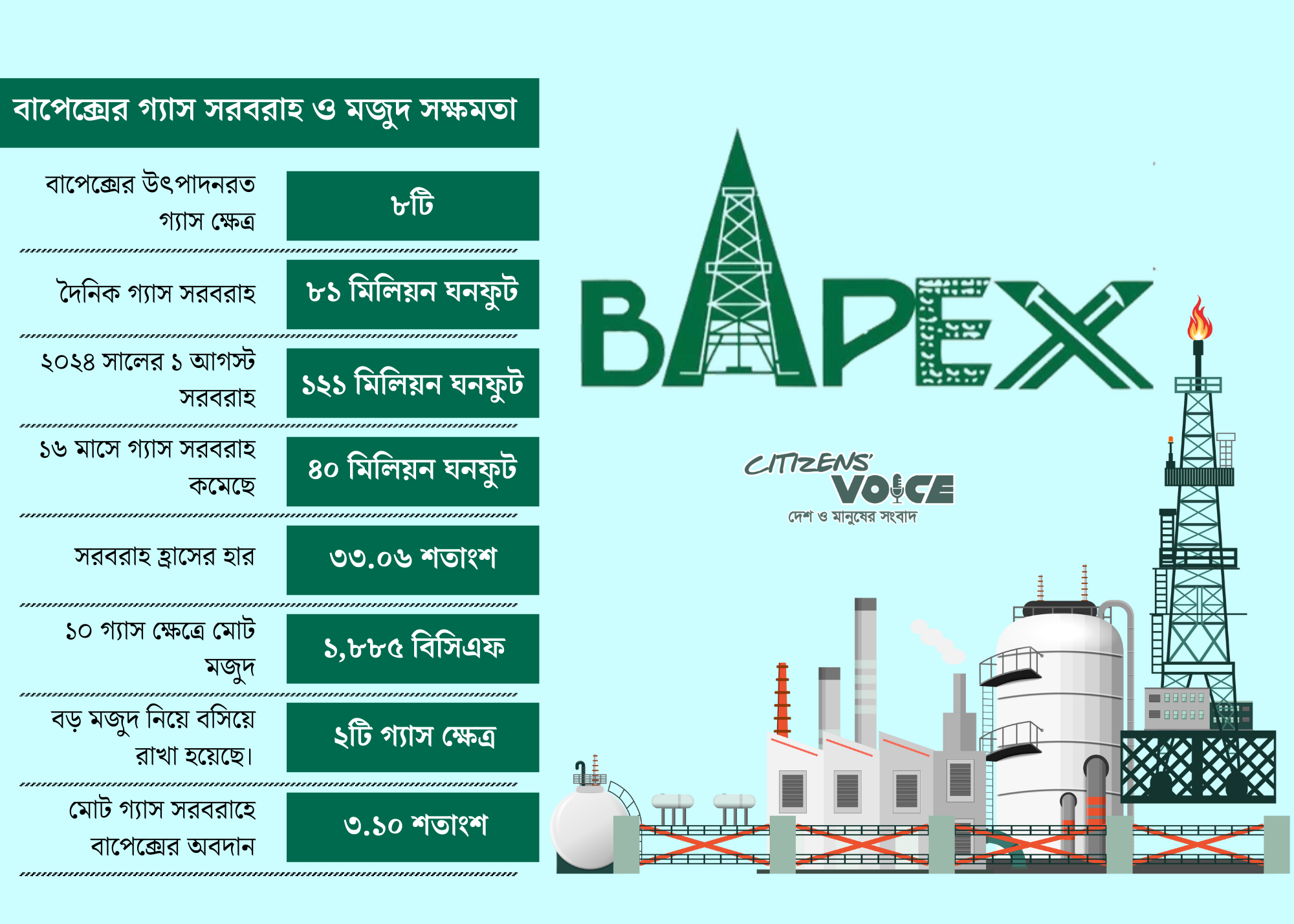 পেট্রোবাংলার তথ্য অনুযায়ী, গত বছরের ১ আগস্ট গ্রিডে গ্যাস সরবরাহ ছিল ২ হাজার ৬৩৪ মিলিয়ন ঘনফুট। এর মধ্যে বাপেক্সের সরবরাহ ছিল ১২১ মিলিয়ন ঘনফুট। চলতি মাসের হিসাব অনুযায়ী তা নেমে এসেছে ৮১ মিলিয়ন ঘনফুটে। অর্থাৎ এক বছরেরও বেশি সময়ে বাপেক্সের গ্যাস সরবরাহ কমেছে ৩৩ শতাংশের বেশি। তবে এর মধ্যে মাসভিত্তিক সরবরাহে উৎপাদনে তারতম্য দেখা গেছে। জ্বালানি বিভাগের পক্ষ থেকে ক্রমহ্রাসের বিষয়টি পুরোপুরি অস্বীকার করা হয়নি। মন্ত্রণালয়ের শীর্ষ কর্মকর্তারা জানিয়েছেন, সংস্থার সক্ষমতা বৃদ্ধি ও আধুনিকায়নের জন্য সব ধরনের উদ্যোগ নেওয়া হচ্ছে।