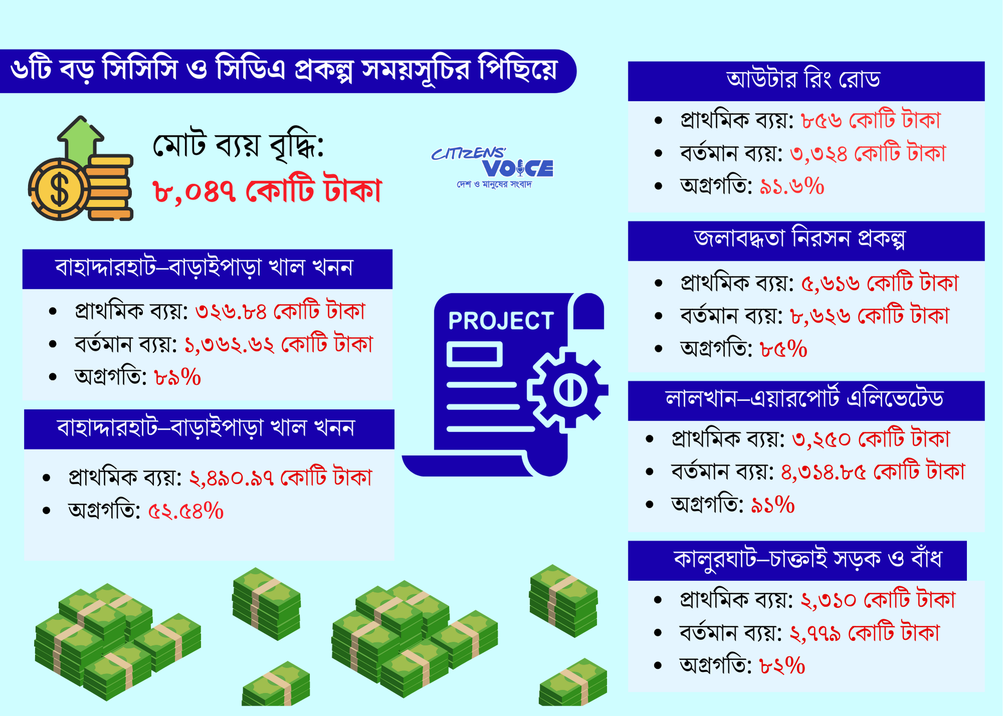 চট্টগ্রামে প্রায় ২৩ হাজার কোটি টাকা ব্যয়ে নেওয়া ছয়টি বৃহৎ উন্নয়ন প্রকল্প দীর্ঘসূত্রতা ও অস্বাভাবিক ব্যয় বৃদ্ধির চাপে পড়েছে। ভূমি অধিগ্রহণে জটিলতা, প্রশাসনিক বিলম্ব এবং একাধিকবার পরিকল্পনা সংশোধনের কারণে প্রকল্পগুলোর কাজ থমকে আছে।