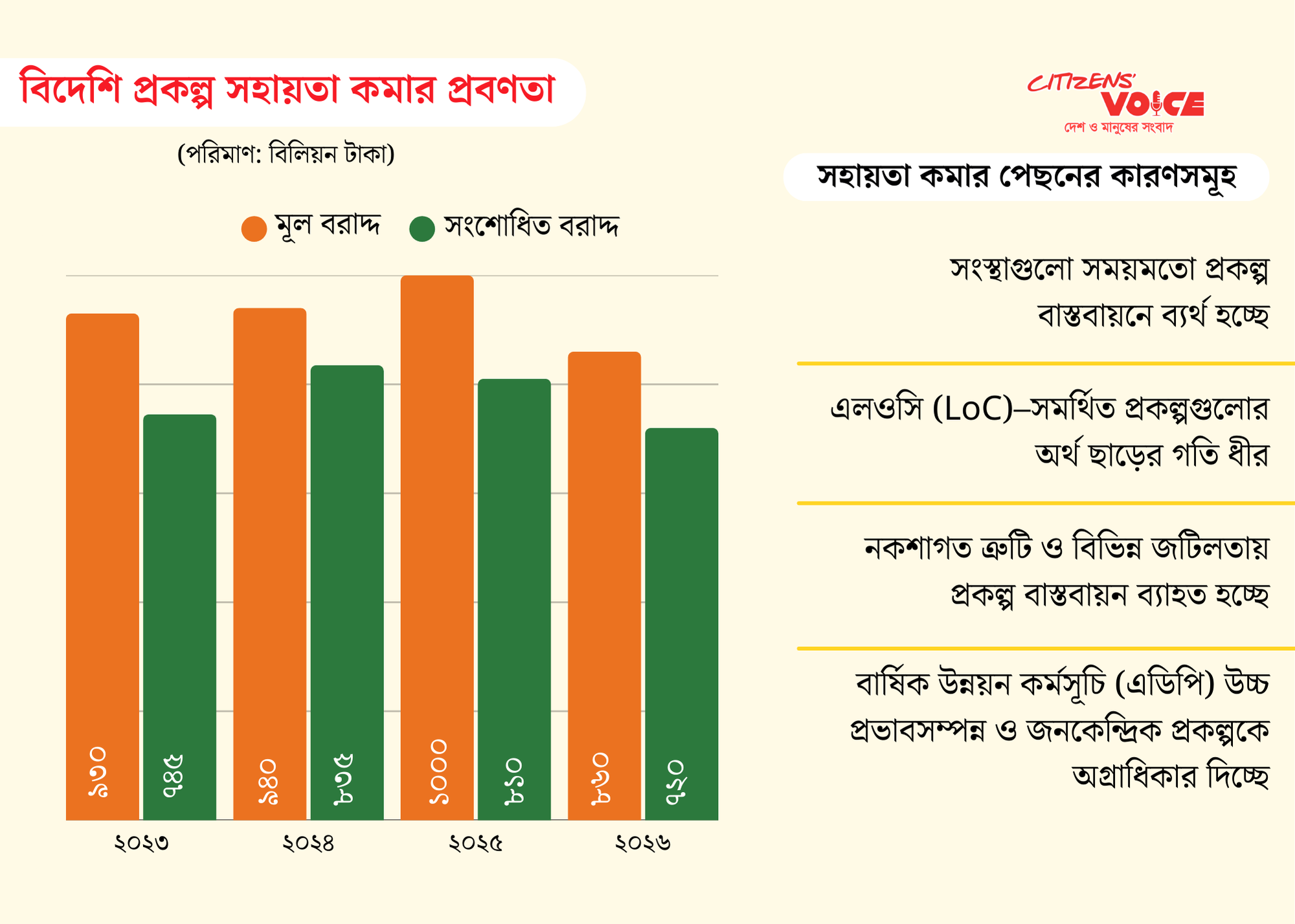 সূত্র বলেছে, বিদেশি প্রকল্প সহায়তা থেকে বরাদ্দ প্রায় ১৪ হাজার কোটি টাকা কমিয়ে ৭২ হাজার কোটি টাকায় নামানো হতে পারে। এর ফলে মূল বার্ষিক উন্নয়ন কর্মসূচিতে ৮৬ হাজার কোটি টাকার বরাদ্দের তুলনায় বিদেশি সহায়তা ১৬.২৮ শতাংশ কমে যাবে। সরকারি কর্মকর্তা বলছেন, এ সিদ্ধান্ত মূলত প্রথম ত্রৈমাসিকে বিভিন্ন মন্ত্রণালয় ও বিভাগের বিদেশি তহবলে অর্থায়িত উন্নয়ন প্রকল্পের ধীরগতি ও অপ্রতুল বাস্তবায়নের প্রেক্ষিতে নেওয়া হয়েছে।