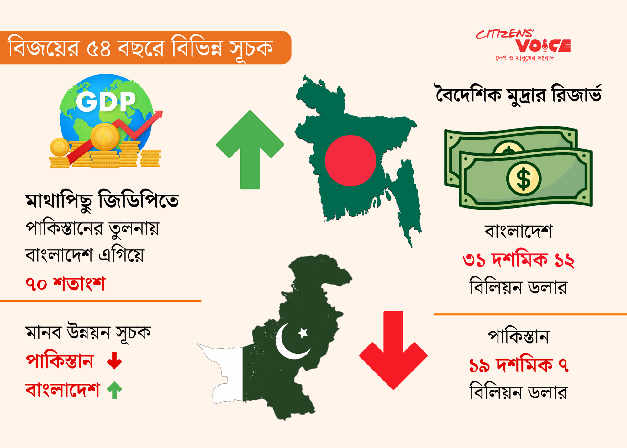 স্বাধীন রাষ্ট্র হিসেবে ৫৪ বছরে বাংলাদেশ অর্থনীতি, মানব উন্নয়ন এবং সামাজিক সূচকে পাকিস্তানকে অনেক পেছনে ফেলে দিয়েছে। মাথাপিছু আয়, রপ্তানি আয়, বৈদেশিক মুদ্রার রিজার্ভ—সব ক্ষেত্রেই বাংলাদেশ এখন এগিয়ে।
