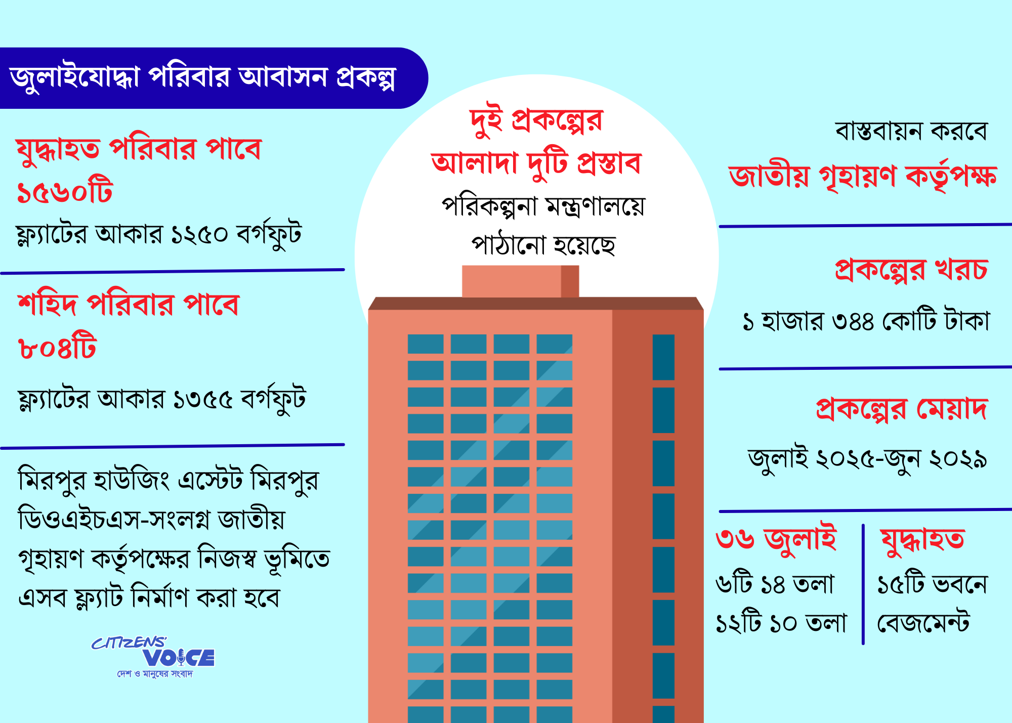 অন্যদিকে মিরপুর-১৪ এলাকায় শহিদ পরিবারের জন্য ‘৩৬ জুলাই’ নামে পৃথক প্রকল্প অনুমোদিত হয়েছে। এতে ৮০৪টি ফ্ল্যাট নির্মিত হবে। ১৮টি ভবনের মধ্যে ছয়টি ১৪ তলা ভবনে ৬০০টি এবং ১২টি ১০ তলা ভবনে ২০৪টি ফ্ল্যাট থাকবে। প্রতিটি ফ্ল্যাটের আয়তন ১ হাজার ৩৫৫ বর্গফুট। প্রকল্পের মোট ব্যয় ধরা হয়েছে ৭৬১ কোটি টাকা। এর মধ্যে শুধু ভবন নির্মাণেই খরচ হবে ৬৬২ কোটি টাকা। কাজ শুরু হবে জানুয়ারি ২০২৬ এবং শেষ হবে ডিসেম্বর ২০২৯।
