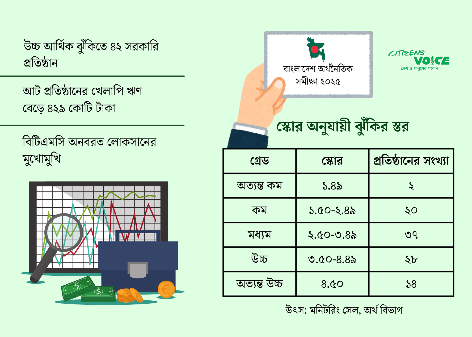 সরকারি খাতের ৪২টি প্রতিষ্ঠান আর্থিকভাবে উচ্চ ঝুঁকিতে রয়েছে। অর্থ মন্ত্রণালয় বিভিন্ন আর্থিক অনুপাতের মানদণ্ড ব্যবহার করে এই ঝুঁকি মূল্যায়ন করেছে। দেশে বর্তমানে ২৩৫টি স্বশাসিত, স্বায়ত্তশাসিত ও সংবিধিবদ্ধ প্রতিষ্ঠান আছে। তবে বেশ কিছু প্রতিষ্ঠান সেবামূলক হওয়ায়, আর্থিক কাজে পরিচালিত ১০১টি রাষ্ট্রায়ত্ত ও স্বায়ত্তশাসিত সংস্থার দেনা ও সম্ভাব্য দায় বিবরণী বিশ্লেষণ করে এই তথ্য উঠে এসেছে। সম্প্রতি প্রকাশিত বাংলাদেশ অর্থনৈতিক সমীক্ষা (২০২৫) এ এমন তথ্য প্রকাশিত হয়েছে।