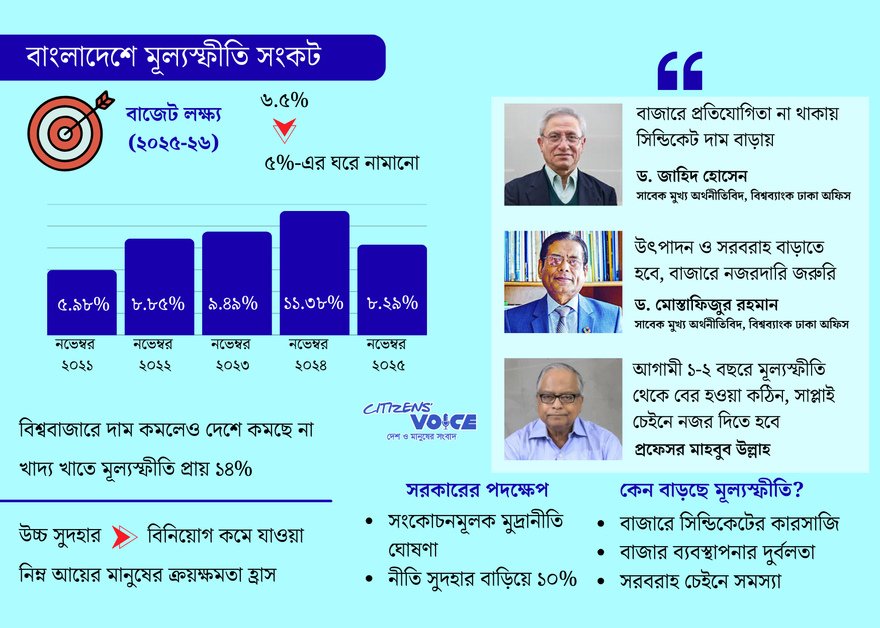 বাংলাদেশ ব্যাংকের গভর্নর আহসান এইচ মনসুর মূল্যস্ফীতি নিয়ন্ত্রণকে চ্যালেঞ্জ হিসেবে দেখেন। তিনি সংকোচনমূলক মুদ্রানীতি ঘোষণা করেন। নীতি সুদ তিন দফায় বাড়িয়ে ১০ শতাংশে নিয়ে যান। চলতি অর্থবছর (২০২৫-২৬) মূল্যস্ফীতি ৬.৫ শতাংশের লক্ষ্য ধরা হয়েছে। তবে বাস্তবে এটি ৮ শতাংশের ওপরে রয়েছে। খাদ্য ও খাদ্যবহির্ভূত খাতের দামও বেড়েছে। গ্রাম-শহর সব জায়গায় মূল্যস্ফীতি বাড়ছে। তাই এটি এখনো সরকারের মাথা ব্যথার কারণ।