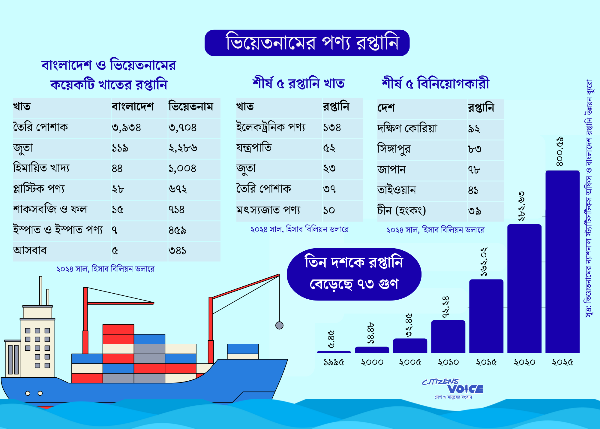 নব্বইয়ের দশকে উভয় দেশের অর্থনীতি তৈরি পোশাক খাতের ওপর ভর করে এগোতে শুরু করে। তবে পরে ভিয়েতনাম বৈচিত্র্যময় বিদেশি বিনিয়োগ আকৃষ্ট করে দ্রুত এগিয়ে যায়। বাংলাদেশ সেই তুলনায় চার দশক ধরে এক পণ্যের ওপর নির্ভরশীল থাকে।