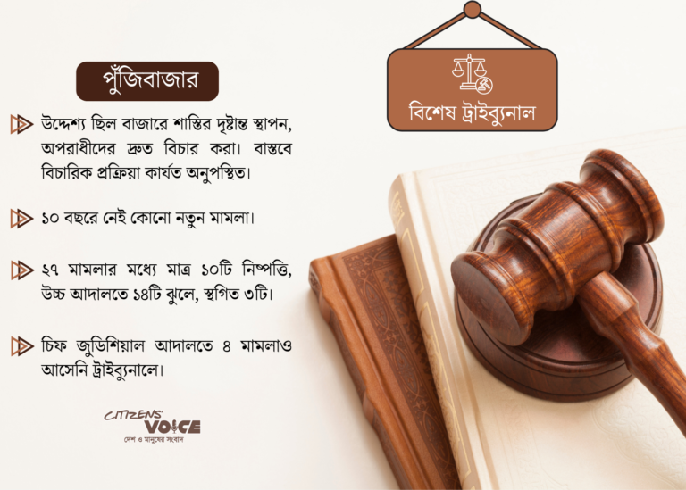 দেশের পুঁজিবাজারে বড় ধরনের অনিয়ম ও অপরাধের দ্রুত বিচার নিশ্চিত করতে যে বিশেষ ট্রাইব্যুনাল গঠন করা হয়েছিল, তা আজ এক দশক ধরে কার্যত নিষ্ক্রিয়। বাংলাদেশ সিকিউরিটিজ অ্যান্ড এক্সচেঞ্জ কমিশনের (বিএসইসি) অধীনে থাকা এই ট্রাইব্যুনালে গত ১০ বছরে একটি নতুন মামলাও আসেনি। শুধুমাত্র ১৯৯৬ ও ২০১০ সালের বাজার ধস-সংক্রান্ত ২৭টি পুরোনো মামলাই এর অস্তিত্বের প্রমাণ বহন করছে।
