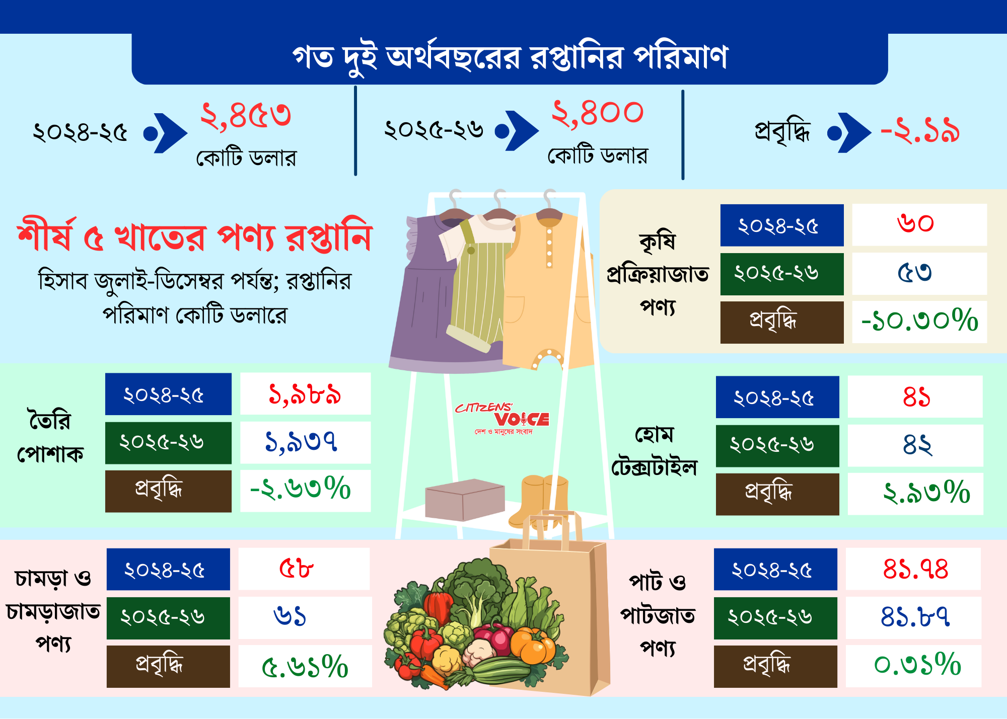 চামড়া ও চামড়াজাত পণ্য, হোম টেক্সটাইল এবং পাট ও পাটজাত পণ্যের রপ্তানি প্রথমার্ধে বেড়েছিল। কিন্তু ডিসেম্বর মাসে তিন খাতের রপ্তানি কমেছে। চামড়া ও চামড়াজাত পণ্যের রপ্তানি ৬১ কোটি ডলার। এটি আগের বছরের তুলনায় ৫.৬১ শতাংশ বেশি। তবে ডিসেম্বরে রপ্তানি হয়েছে ৯.৭২ কোটি ডলার, যা আগের বছরের ডিসেম্বরে ১২.৩৬ শতাংশ কম। হোম টেক্সটাইল খাতের রপ্তানি প্রথমার্ধে ৪২ কোটি ডলার। আগের বছরের তুলনায় বেড়েছে ২.৯৩ শতাংশ। ডিসেম্বরে রপ্তানি কমেছে ৭.৭৬ শতাংশ, হয়েছে ৭.৭৫ কোটি ডলার।