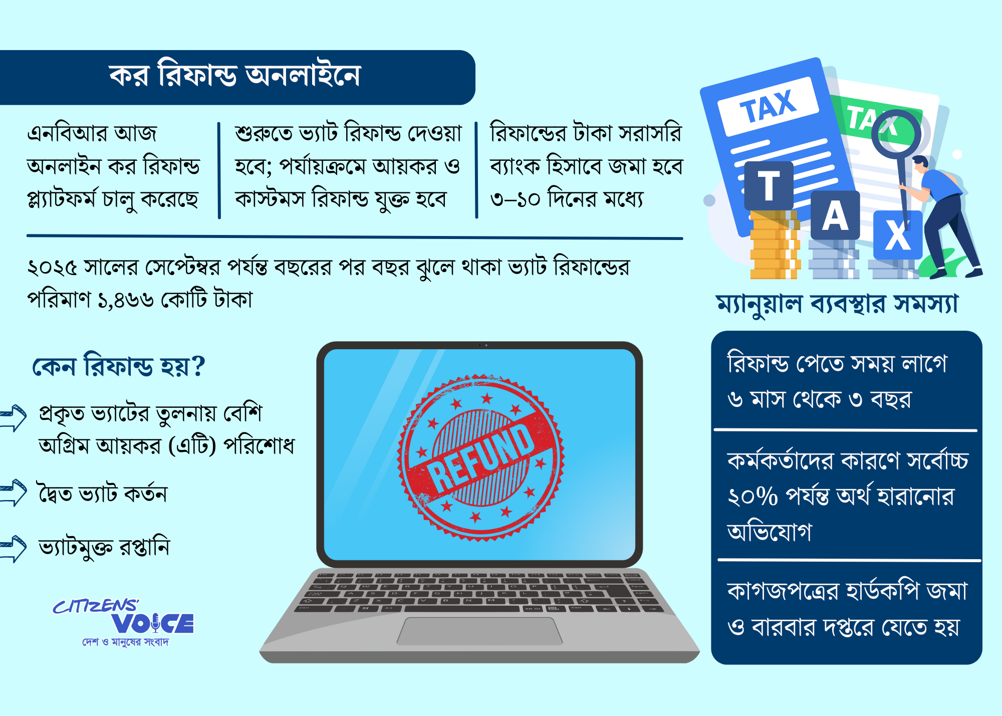 জাতীয় রাজস্ব বোর্ড (এনবিআর) সূত্রে জানা গেছে, গত সেপ্টেম্বর পর্যন্ত কেবল ভ্যাট উইংয়ের কাছে ব্যবসায়ীদের জন্য তৈরি রিফান্ডের পরিমাণ দাঁড়িয়েছে ১,৪৬৬ কোটি টাকা। এর একটি বড় অংশ বছরের পর বছর ধরে আটকে আছে। এছাড়া আয়কর ও কাস্টমস উইংয়ে কত রিফান্ড তৈরি হয়েছে, তার সামষ্টিক কোনো তথ্য প্রকাশ করা হয়নি। তবে এনবিআর সূত্র জানিয়েছে, এই পরিমাণও কয়েক হাজার কোটি টাকার বেশি হবে।
