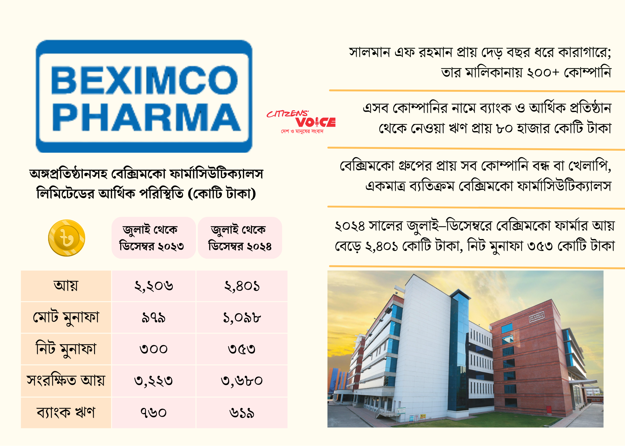 তবে শত কোম্পানির মধ্যে একমাত্র ব্যতিক্রম হলো বেক্সিমকো ফার্মাসিউটিক্যালস লিমিটেড। সালমান এফ রহমানের কারাগারে থাকার পরও এই পুঁজিবাজারে তালিকাভুক্ত ওষুধ উৎপাদনকারী কোম্পানির আয় ও মুনাফা বৃদ্ধি পেয়েছে। পাশাপাশি ব্যাংক ঋণের পরিমাণও কমেছে। কোম্পানির আর্থিক প্রতিবেদন ও সংশ্লিষ্ট সূত্রে এসব তথ্য পাওয়া গেছে। বেক্সিমকো ফার্মাসিউটিক্যালস লিমিটেডের অনিরীক্ষিত আর্থিক প্রতিবেদনের তথ্য বিশ্লেষণে দেখা গেছে, কোম্পানির আয় ও মুনাফা নিরন্তর বৃদ্ধি পেয়েছে।