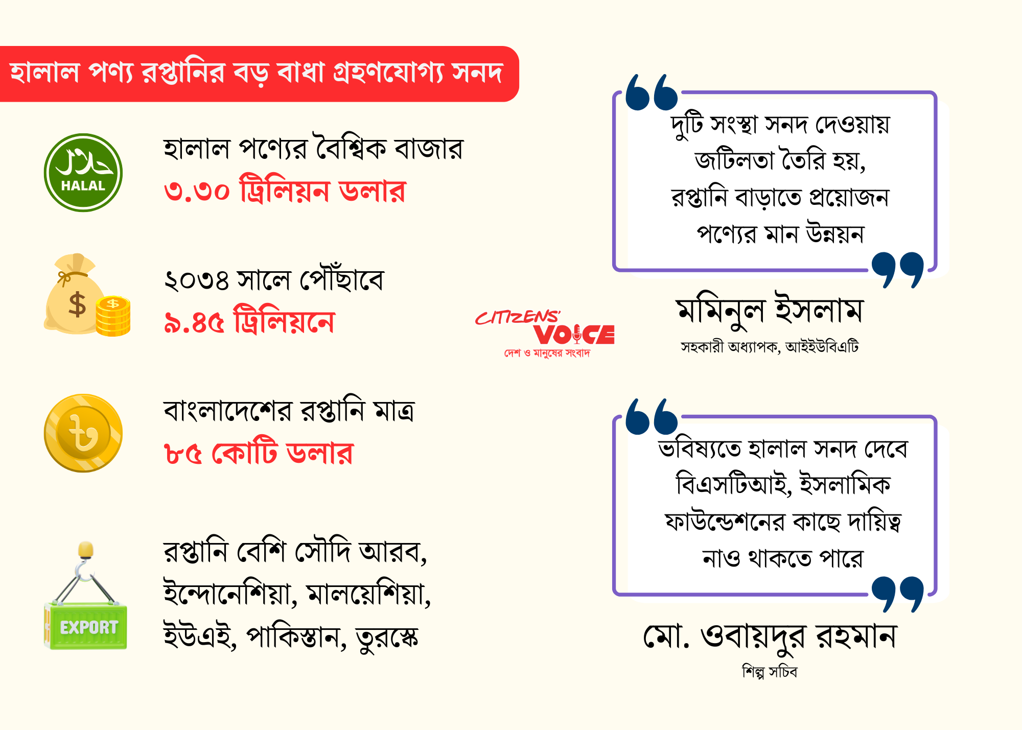 বিশ্বব্যাপী হালাল পণ্যের চাহিদা প্রায় ১৩ শতাংশ হারে বাড়ছে। বিশেষজ্ঞদের অনুমান, ২০৩৪ সালের মধ্যে বৈশ্বিক বাজার ৯.৪৫ ট্রিলিয়ন ডলারে পৌঁছাতে পারে। এই বিশাল বাজারে বাংলাদেশের অংশ মাত্র 0.0৩ শতাংশ।