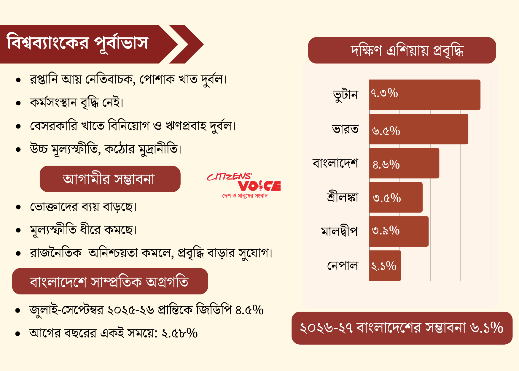 বিশ্বব্যাংকের গ্লোবাল ইকোনমিক প্রসপেক্টস জানুয়ারি সংস্করণে বাংলাদেশের অর্থনীতি নিয়ে এই মূল্যায়ন প্রকাশিত হয়েছে। প্রতিবেদনে বলা হয়েছে, সাম্প্রতিক চাপ সত্ত্বেও ভোক্তা ব্যয় বেড়ে যাওয়া, মূল্যস্ফীতির চাপ ধীরে ধীরে কমে আসা এবং রাজনৈতিক অনিশ্চয়তা কমলে প্রবৃদ্ধি পুনরুদ্ধারের সুযোগ তৈরি হতে পারে।