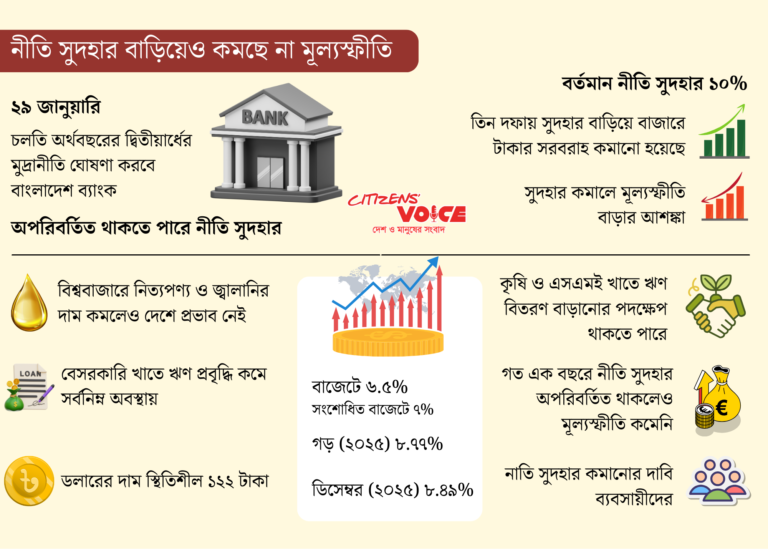 এ পরিস্থিতিতে ২৯ জানুয়ারি বাংলাদেশ ব্যাংক চলতি অর্থবছরের শেষ ছয় মাসের জন্য মুদ্রানীতি ঘোষণা করবে। এই মুদ্রানীতি থেকে জানা যাবে উচ্চ মূল্যস্ফীতি নিয়ন্ত্রণে ব্যাংক ঋণের সুদ আরও বাড়বে কি না, বাজারে টাকার সরবরাহ বাড়বে বা লাগাম টানা হবে, এবং বিনিয়োগ স্থবিরতা কাটাতে কোনো উদ্যোগ নেওয়া হবে কি না।