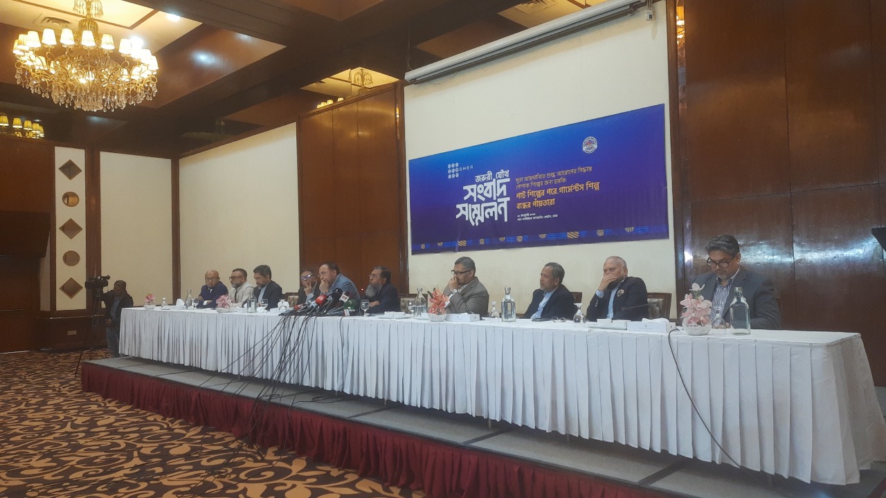 ‘সুতা আমদানিতে শুল্ক আরোপের সিদ্ধান্ত পোশাক শিল্পের জন্য হুমকি: পাট শিল্পের পরে গার্মেন্টস শিল্প বন্ধের পাঁয়তারা’ শীর্ষক সংবাদ সম্মেলনে লিখিত বক্তব্য পাঠ করেন বিজিএমইএর ভারপ্রাপ্ত সভাপতি সেলিম রহমান। এ সময় উপস্থিত ছিলেন বিকেএমইএর সভাপতি মোহাম্মদ হাতেম, নির্বাহী সভাপতি ফজলে শামীম এহসান, বিজিএমইএর সিনিয়র সহ সভাপতি ইনামুল হক খান, সহ সভাপতি রেজওয়ান সেলিম, পরিচালক ফয়সাল সামাদসহ উভয় সংগঠনের নেতারা।