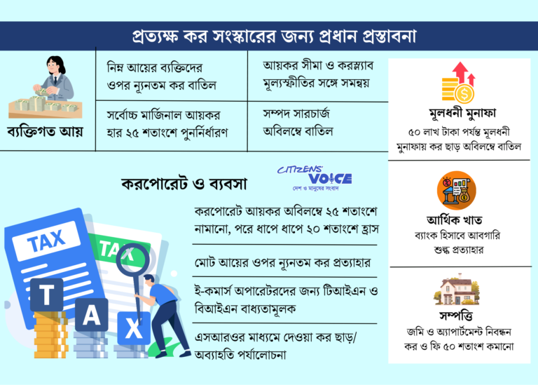 প্রতিবেদনে বলা হয়েছে, বর্তমান কর–জিডিপি অনুপাত প্রায় ১০ শতাংশ কিন্তু ২০৩০ সালের মধ্যে এটি ১২ শতাংশ এবং ২০৩৫ সালের মধ্যে ১৫ থেকে ২০ শতাংশে উন্নীত করার লক্ষ্য রাখা হয়েছে। এ লক্ষ্য অর্জনের জন্য কাঠামোগত সংস্কার অপরিহার্য। টাস্কফোর্স সুপারিশ করেছে, কর কাঠামো পুনর্বিন্যাসের মাধ্যমে প্রত্যক্ষ করের অংশ বর্তমান ৩০ শতাংশ থেকে বাড়িয়ে ৫০ শতাংশে উন্নীত করতে হবে। এটি দেশের কর ব্যবস্থাকে আরও ন্যায্য ও প্রবৃদ্ধিবান্ধব করবে।