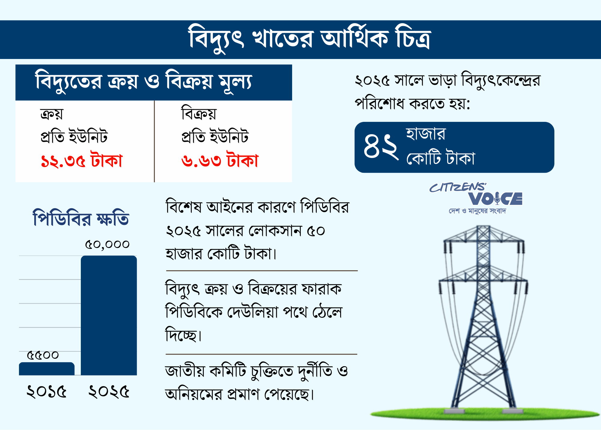 পিডিবির ক্ষতির হিসাব ২০১৫ সালে ৫ হাজার ৫০০ কোটি টাকা থেকে ২০২৫ সালে ৫০ হাজার কোটি টাকার বেশি পৌঁছেছে। ২০১১ থেকে ২০২৪ সালের মধ্যে বিদ্যুতের উৎপাদন চারগুণ বেড়েছে, কিন্তু বেসরকারি কেন্দ্রকে দেওয়া অর্থ বেড়েছে ১১ গুণ, ক্যাপাসিটি পেমেন্ট বেড়েছে ২০ গুণ।