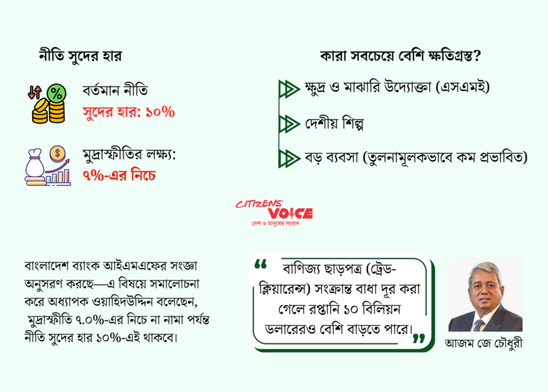 তিনি আরও যোগ করেন, ব্যাংকগুলো যেটুকু কম সুদে ক্ষুদ্র ও মাঝারি ব্যবসায়ীদের জন্য ঋণ দিতে চায়, বাস্তবে তা কার্যকর হয় না। কারণ ব্যাংকগুলোর নিজের তহবিলের সুদের হার যত বেশি থাকে, তত কম সুদে ঋণ দেওয়া সম্ভব হয় না। তিনি বলেন, “এখন সময় এসেছে সুদের হার এবং মুদ্রাস্ফীতির মধ্যে সমন্বয় করার।”