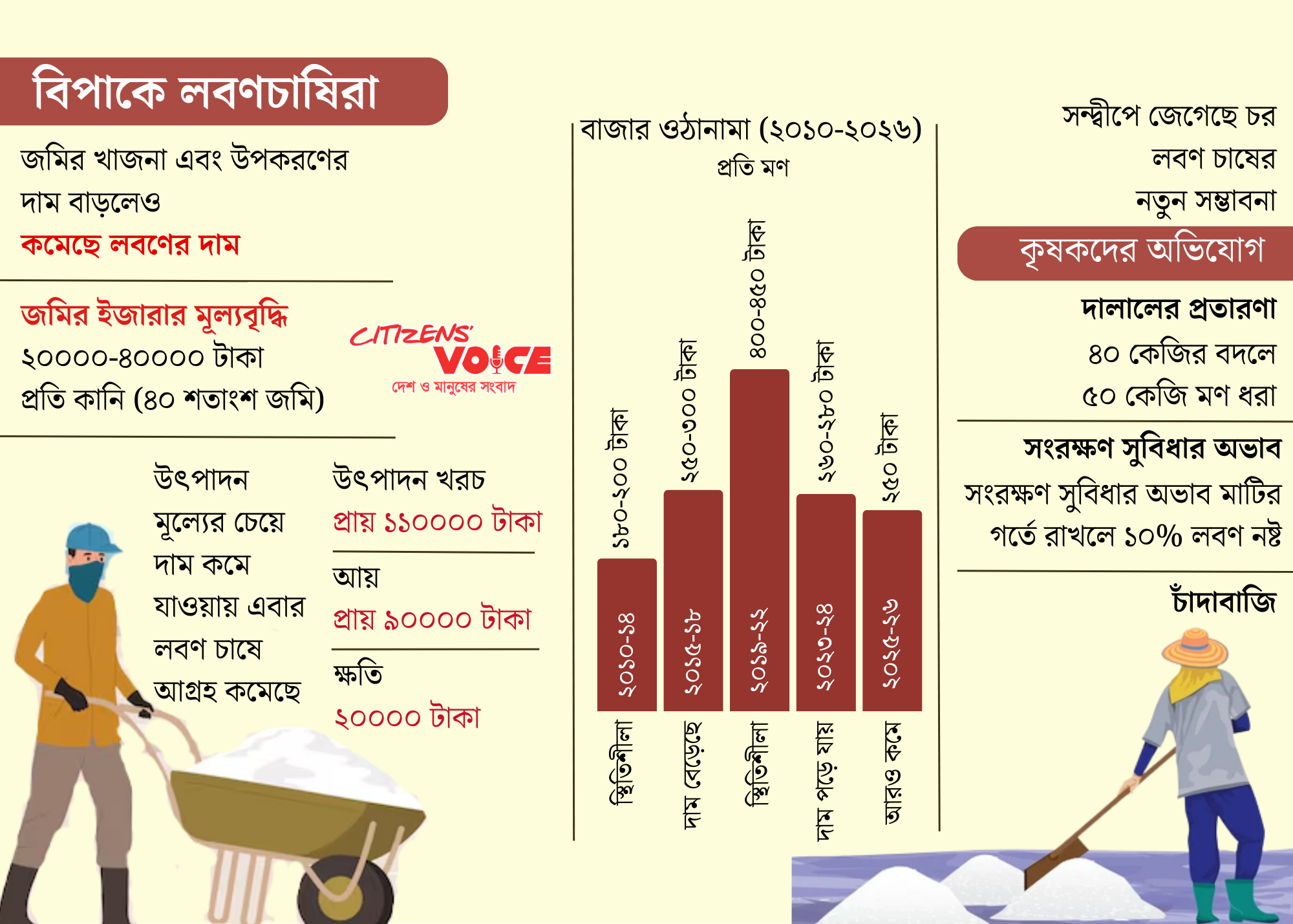 অন্যদিকে, প্রতি কানি জমিতে গড়ে ৩৫০ মণ লবণ উৎপাদন হয়। প্রতি মণ ২৫০ টাকায় বিক্রি করলে আয়ের হিসাব দাঁড়ায় প্রায় ৯০ হাজার টাকা। ফলে চাষির ক্ষতি প্রতি কানিতে ২০ হাজার টাকার বেশি।