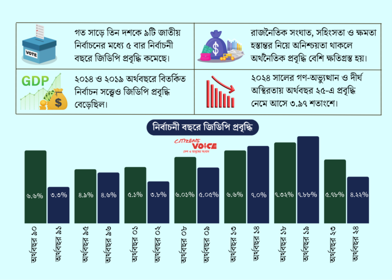 প্রায় ১৩ বছর পর পরিস্থিতি অনেক পরিবর্তিত হয়েছে। রাজনৈতিক ব্যবসায়িক চক্র কতটা প্রভাবিত করছে এবং এর অর্থনৈতিক প্রভাব কী, তা আরও গভীর গবেষণার দাবি রাখে। তবে একটি বিষয় স্পষ্ট, নির্বাচনী বছরে বা নির্বাচনের অর্থবছরে জিডিপি বৃদ্ধি সাধারণত কমে।