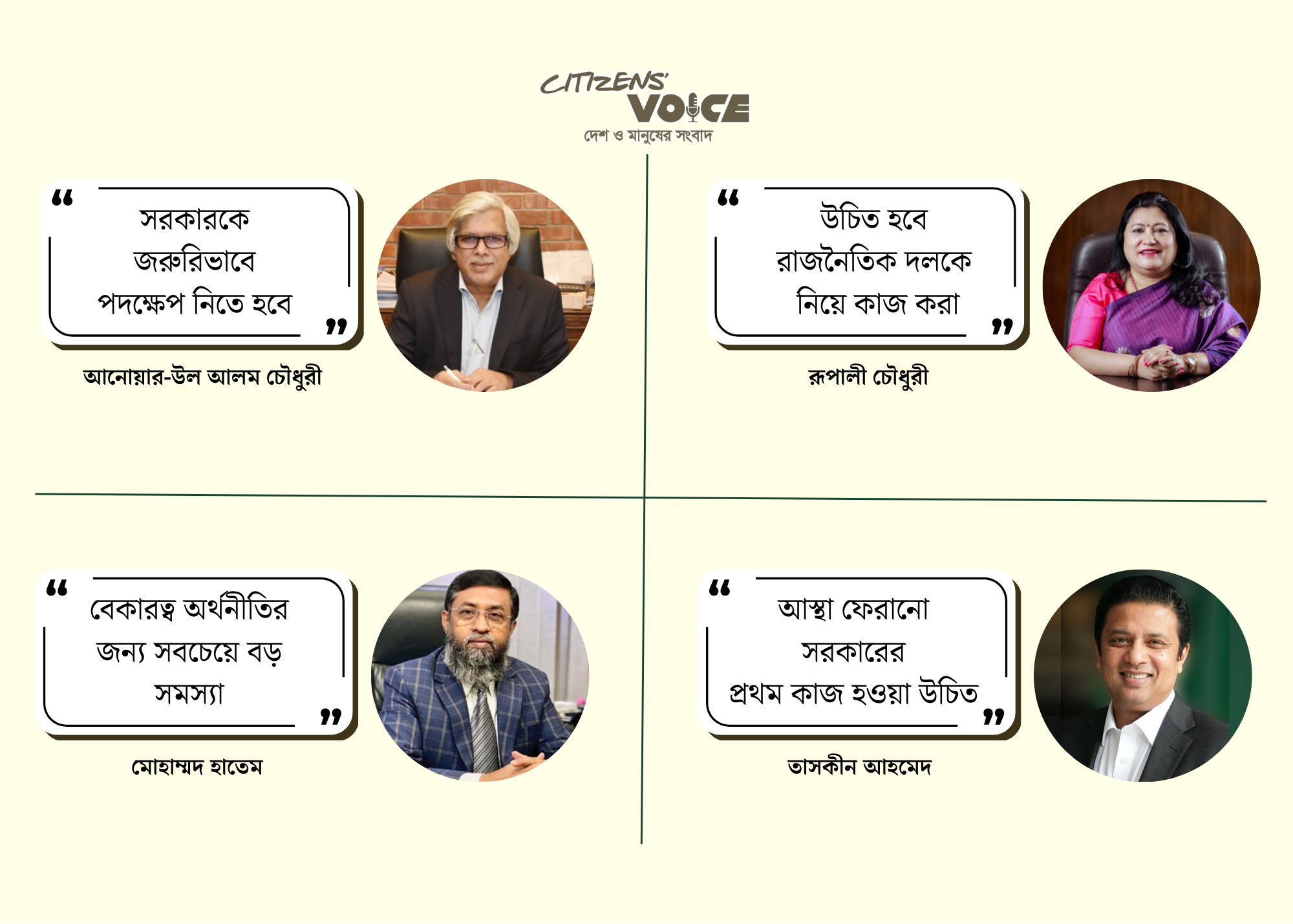 ঢাকা চেম্বার অব কমার্স অ্যান্ড ইন্ডাস্ট্রির (ডিসিসিআই) সভাপতি তাসকীন আহমেদ বলেন, “বেসরকারি খাতে আস্থা ফেরাতে প্রথমে আইনশৃঙ্খলা নিশ্চিত করতে হবে। এরপর ব্যবসা সহজীকরণ, সরবরাহ চেইন উন্নয়ন, জ্বালানি সরবরাহের স্থিতিশীলতা এবং ব্যাংকিং খাতের সংস্কার করতে হবে। এই মৌলিক ক্ষেত্রগুলোতে স্বচ্ছতা থাকলে উদ্যোক্তারা দীর্ঘমেয়াদি বিনিয়োগে আগ্রহী হবেন।”