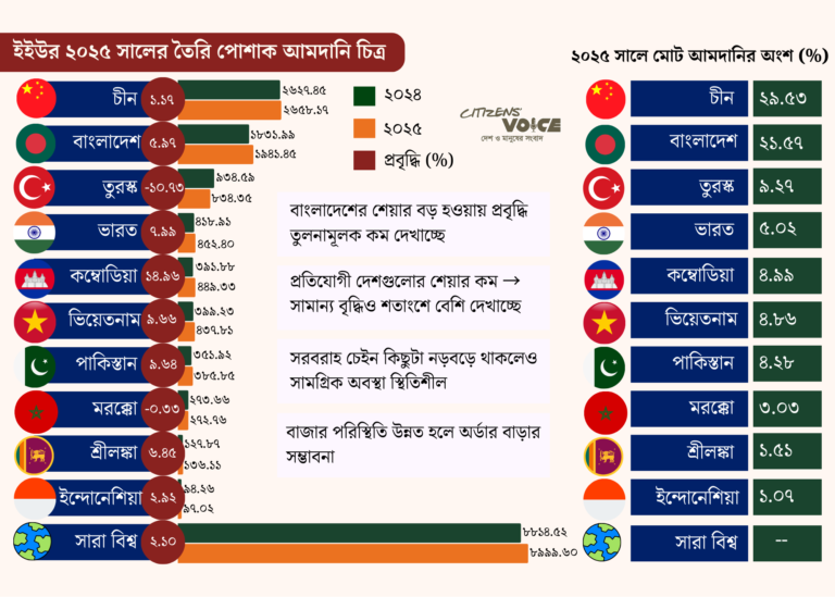 অর্থমূল্য বিবেচনায় বাংলাদেশের অবস্থান এখনো শক্তিশালী। ২০২৪ সালে ইইউর পোশাক আমদানিতে বাংলাদেশের অংশ ছিল ২০.৭৮ শতাংশ। ২০২৫ সালে এটি বেড়ে দাঁড়িয়েছে ২১.৫৭ শতাংশ। চীনের হিস্যা কমে ২৯.৫৩ শতাংশে নেমেছে। তৃতীয় অবস্থানের তুরস্কের হিস্যা দুই অংকের ঘর থেকে কমে ৯.২৭ শতাংশে এসেছে।