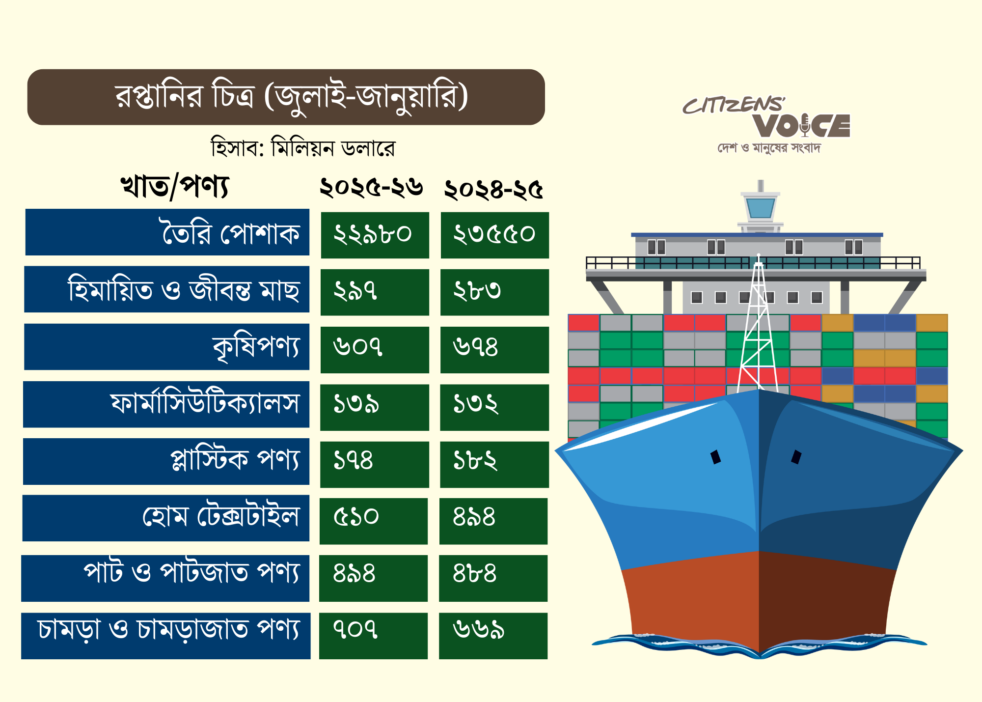 রপ্তানি উন্নয়ন ব্যুরো–এর তথ্য অনুযায়ী, ২০২৬ সালের জানুয়ারি মাসে বাংলাদেশের রপ্তানি আয় ০.৫ শতাংশ কমে ৪.৪১ বিলিয়ন ডলারে নেমে এসেছে। গত বছরের একই সময়ে রপ্তানি আয় ছিল ৪.৪৩ বিলিয়ন ডলার। চলতি ২০২৫-২৬ অর্থবছরের জুলাই-জানুয়ারি সময়ের হিসাব অনুযায়ী, রপ্তানি আয় ১.৯৩ শতাংশ কমে ২৮.৪১২ বিলিয়ন ডলারে নেমে এসেছে। এটি গত অর্থবছরের একই সময়ের ২৮.৯৬ বিলিয়ন ডলারের তুলনায় কম।