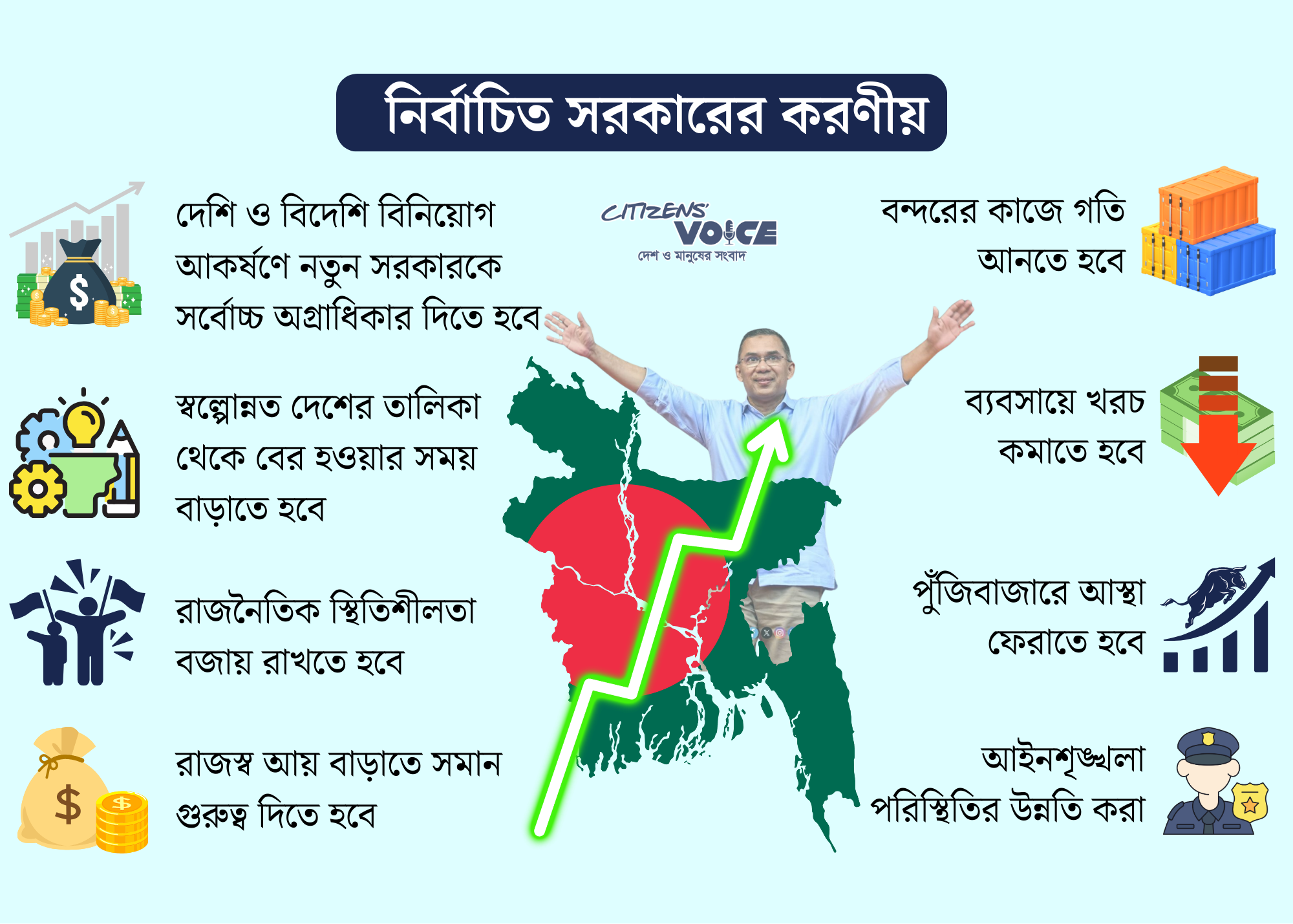বাংলাদেশের অর্থনীতি সচল রাখতে নতুন সরকারের জন্য সবচেয়ে বড় চ্যালেঞ্জ হলো দেশি ও বিদেশি বিনিয়োগ আকৃষ্ট করা। ব্যবসায়ী ও অর্থনীতির বিশ্লেষকরা মনে করছেন, এর প্রথম ধাপ হওয়া উচিত আইনশৃঙ্খলা নিশ্চিত করা। বেসরকারি খাতে আস্থা পুনরুদ্ধার, ব্যবসায়িক পরিবেশকে নিরাপদ করা এবং অর্থনৈতিক অপরাধ দমনে জিরো টলারেন্স নীতি গ্রহণ নতুন সরকারের অগ্রাধিকার হওয়া উচিত।