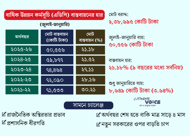 শুধু জানুয়ারিই নয়, অর্থবছরের প্রথম সাত মাসেও গতি ছিল কম। জুলাই থেকে জানুয়ারি পর্যন্ত ব্যয় হয়েছে ৫০ হাজার ৫৫৬ কোটি টাকা। যা মোট বরাদ্দের ২১ দশমিক ১৮ শতাংশ। সাম্প্রতিক বছরগুলোর মধ্যে এটি সর্বনিম্ন বাস্তবায়ন হার। চলতি অর্থবছরে এডিপির মোট বরাদ্দ রাখা হয়েছে ২ লাখ ৩৮ হাজার ৬৯৫ কোটি ৬৪ লাখ টাকা।