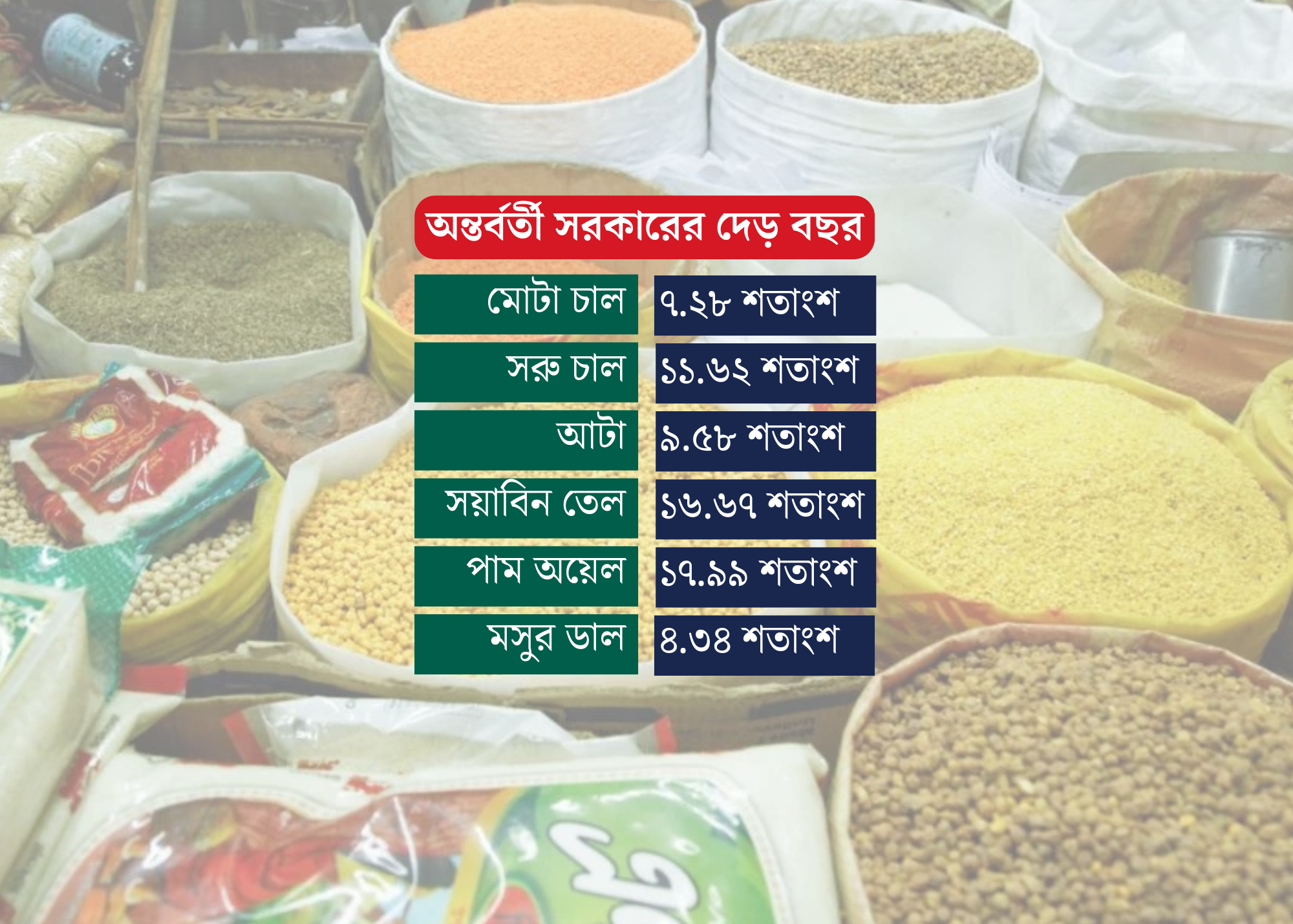 ২০২৪ সালের ৮ আগস্ট দায়িত্ব নেয় অন্তর্বর্তী সরকার। দুই দিন পর, ১০ আগস্ট খুচরা বাজারের যে চিত্র তুলে ধরে ট্রেডিং করপোরেশন অব বাংলাদেশ (টিসিবি), তাতে নিত্যপণ্যের দাম ছিল তুলনামূলক স্থিতিশীল। টিসিবির তথ্য অনুযায়ী, সে সময় এক কেজি মোটা চাল বিক্রি হয় ৪৮ থেকে ৫২ টাকায়। সরু চাল ৬০ থেকে ৭৮ টাকা। আটা ৪০ থেকে ৪৫ টাকা। প্রতি লিটার সয়াবিন তেল ১৪৫ থেকে ১৫৫ টাকা। পাম অয়েল ১২৫ থেকে ১৩৫ টাকা। মসুর ডাল ১১৫ থেকে ১২০ টাকায় বিক্রি হয়।