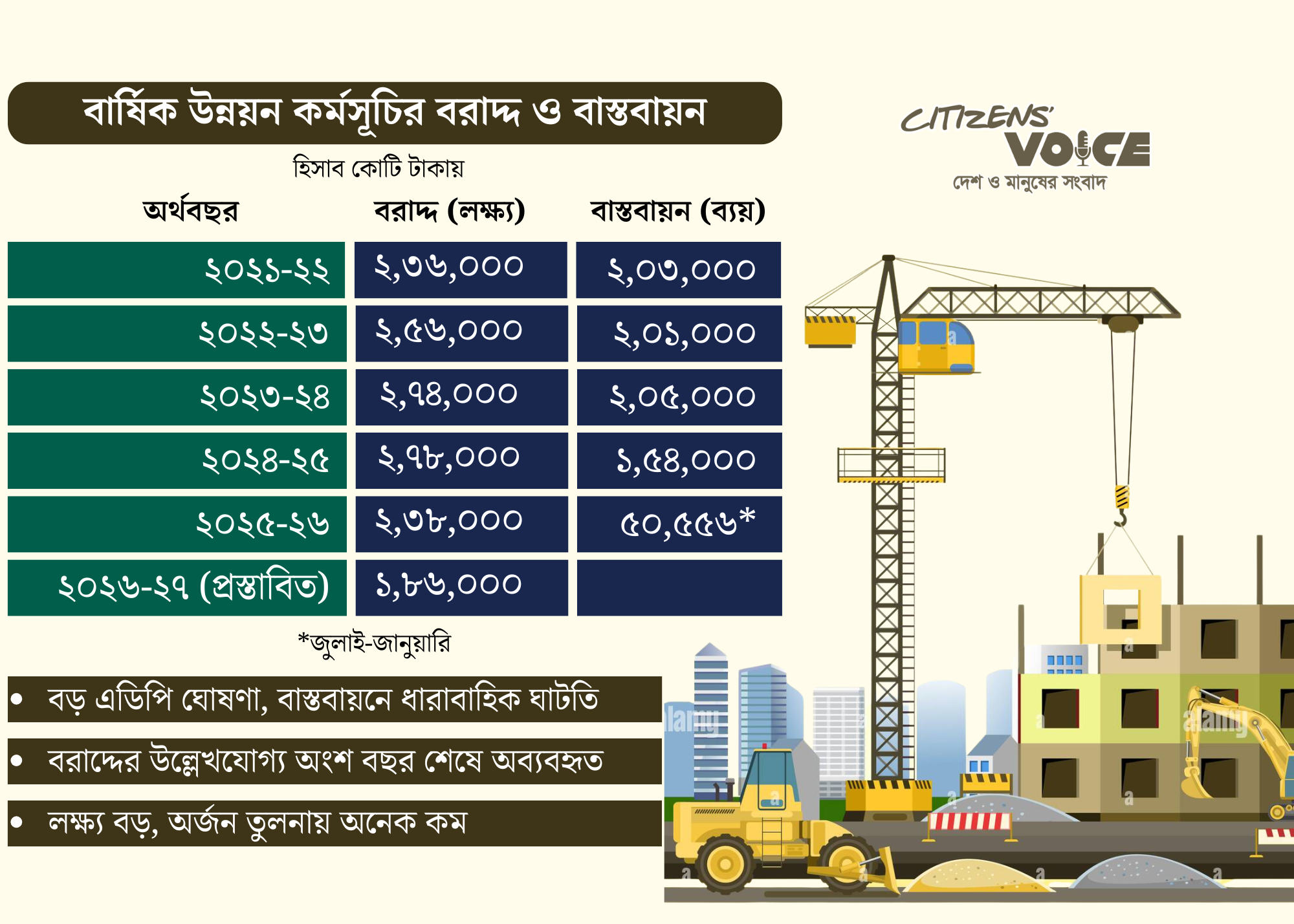 - ২০২২–২৩ বরাদ্দ ২ লাখ ৫৬ হাজার কোটি, বাস্তবায়ন মাত্র ২ লাখ ১ হাজার কোটি।